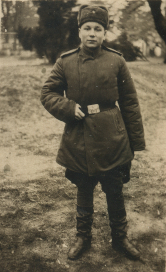 Военнослужащий Советской армии в ватной куртке кавалерийского образца с установленными погонами. Послевоенный снимок. Коллекция автора