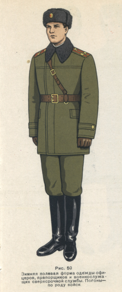 Необходимо отметить, что у большинства офицеров сухопутных войск ничего подобного солдатской ватной куртке не было и зимней одеждой при любой форме служила только шинель. Из исключений можно отметить офицеров, проходивших службу в особо холодных районах, там в инвентарь части отпускались телогрейка и шаровары ватные, а также офицеров военно-строительных отрядов, о которых мы расскажем ниже.