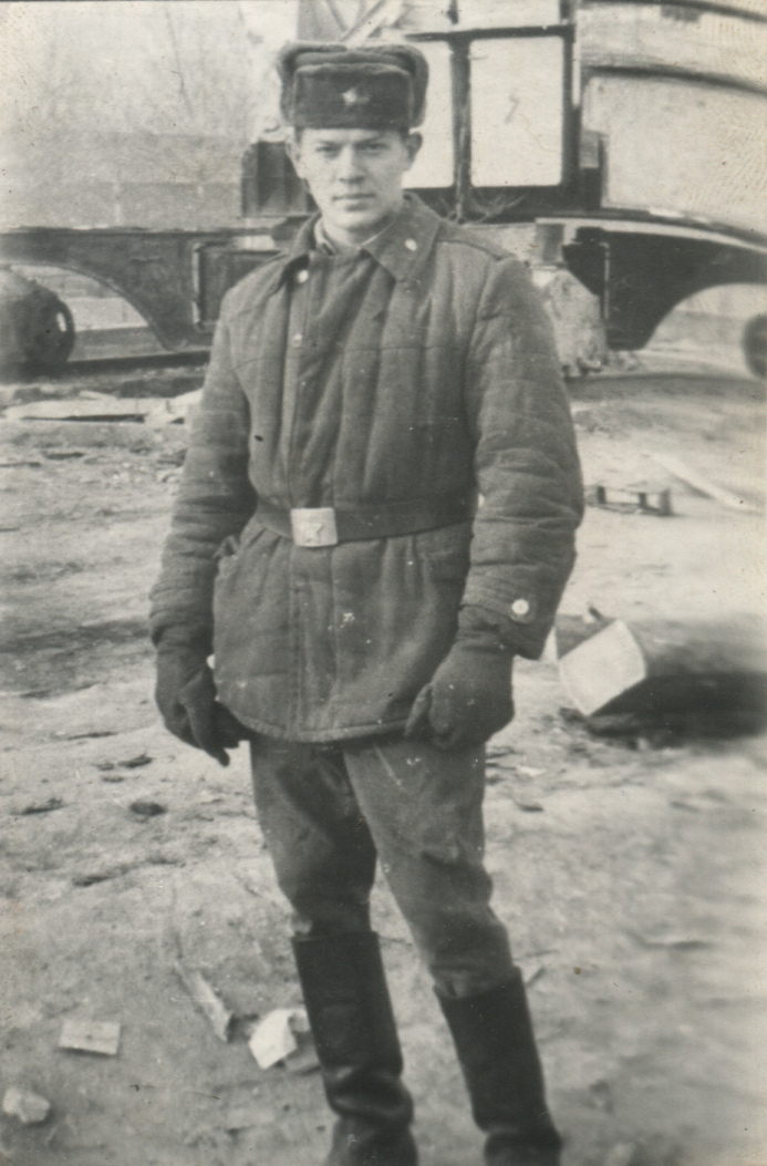 Военный строитель в ватной двубортной куртке с петлицами и погонами. 1962 год. Коллекция автора
