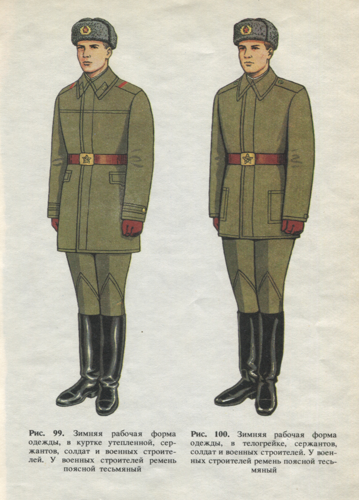 Параллельно, еще с 1958 года, на снабжение рабочих военно-строительных отрядов стала поступать эта же ватная двубортная куртка, но в качестве основного предмета выходного и рабочего обмундирования [20]. Отличительной особенностью курток военных строителей были знаки различия в виде ромбовидных петлиц черного цвета, нашиваемых на воротнике. Погоны рабочим ВСО, да и то для выходного обмундирования (с оставлением старых петлиц), были введены только в 1961 году [21]. В 1964 году ношение погон было распространено и на ватную куртку для рабочего обмундирования военных строителей [22]. В 1966 году военным строителям вместо ватной куртки для выходной формы одежды была введена шинель, аналогичная общеармейской [23].