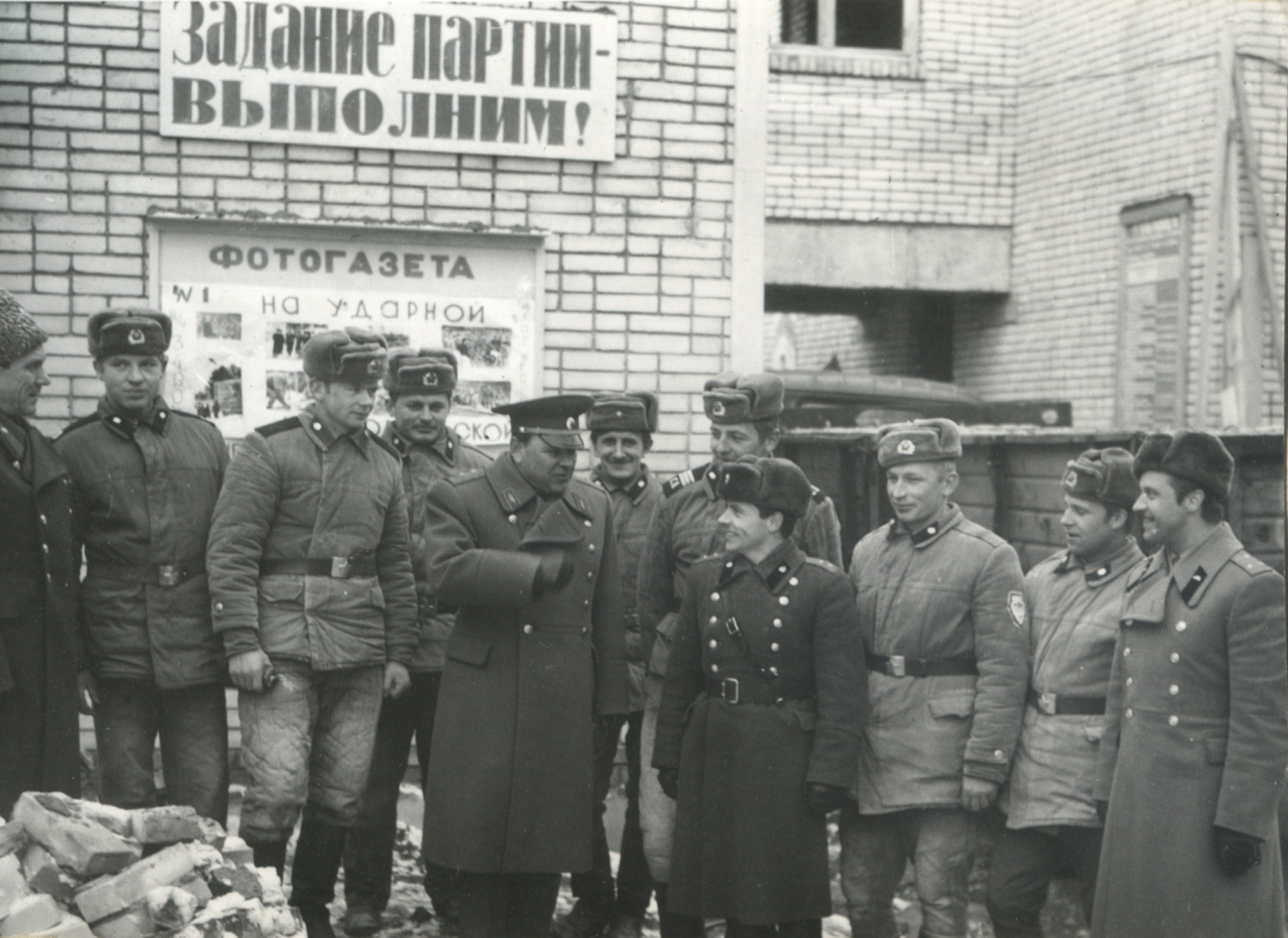Начальник политуправления СибВО генерал-лейтенант И.С. Лыков беседует с военными строителями, одетыми в зимнюю рабочую форму одежды, дополненную ватными стегаными шароварами. Погоны на ватных куртках - нашивные с полем черного и защитного цветов, в т. ч. с буквами «СА». Новосибирское высшее военно-политическое училище, начало 1970-х годов. Коллекция автора