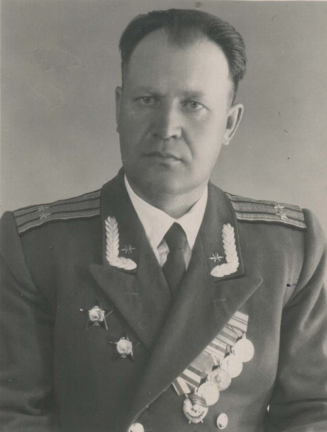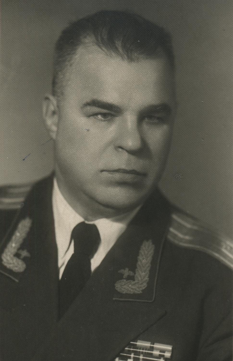 На воротнике парадно-выходного мундира полковника М.А. Клочкова вышитые орнамент и эмблемы, что встречалось довольно редко. Выборг, 1958 г. Коллекция автора
