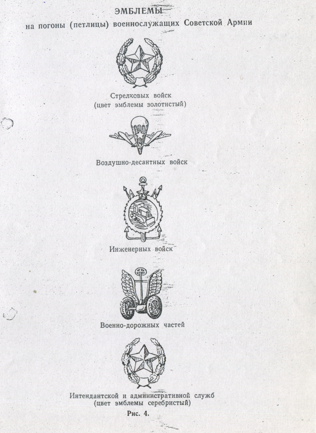 Рисунки эмблем родов войск и служб из типографского издания правил ношения военной формы одежды маршалами Советского Союза, адмиралами Флота Советского Союза, маршалами, генералами, адмиралами и офицерами Советской Армии и Военно-Морского Флота на мирное время (Приказ МО СССР № 105 от 30 июня 1955 г.).