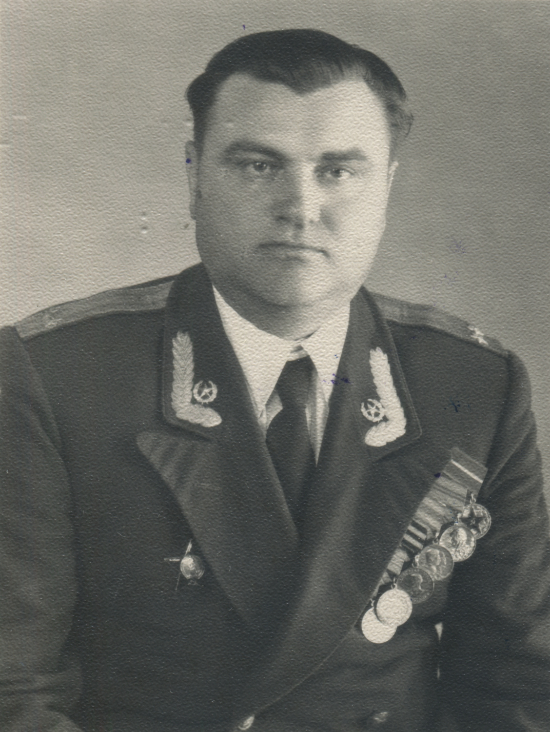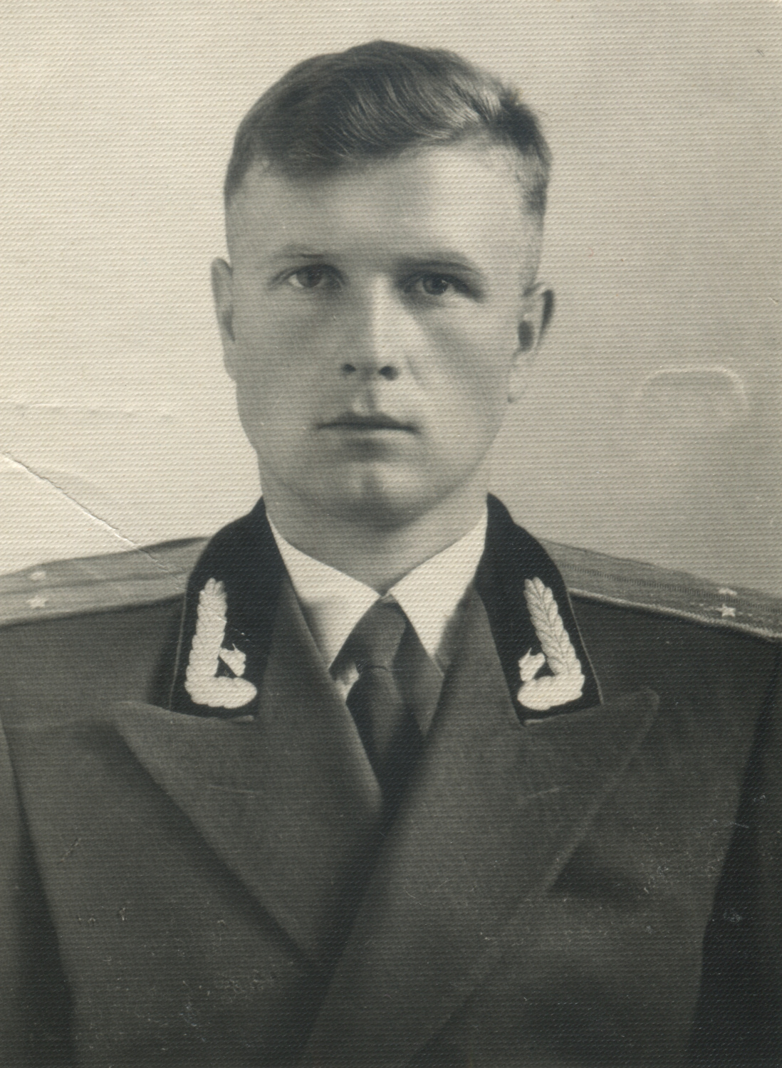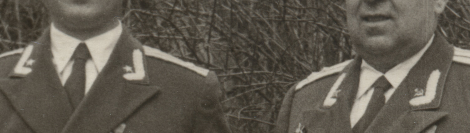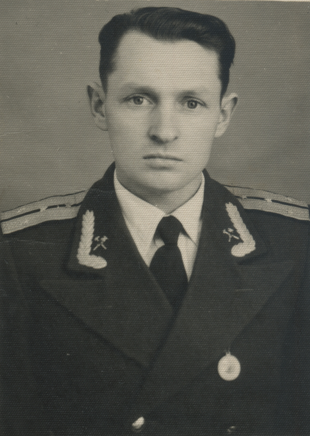 Офицер одной из частей бронетанковых войск Советской армии, по специальности относящийся к инженерным войскам и носящий соответствующие эмблемы на воротнике парадно-выходного мундира БТВ образца 1955 г. с черным бархатным воротником. Коллекция автора