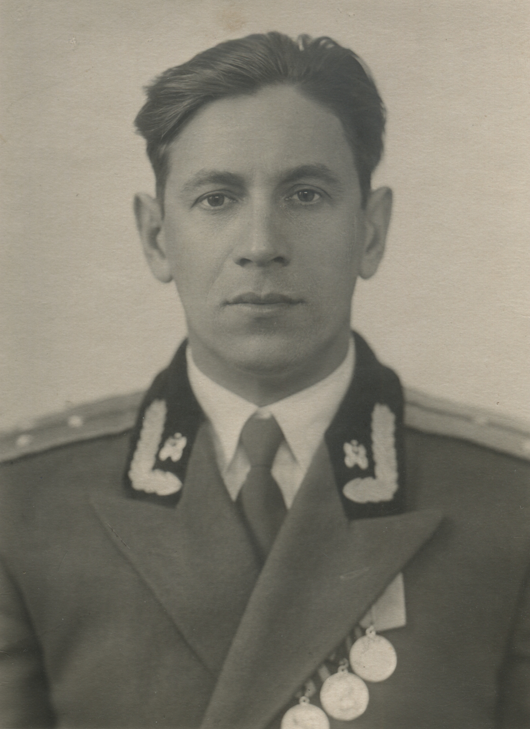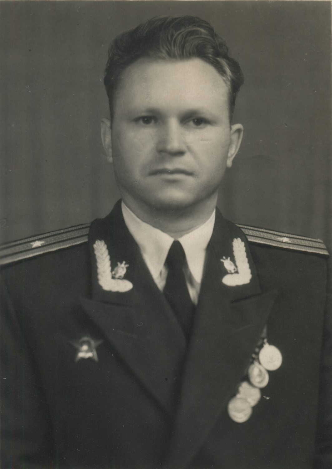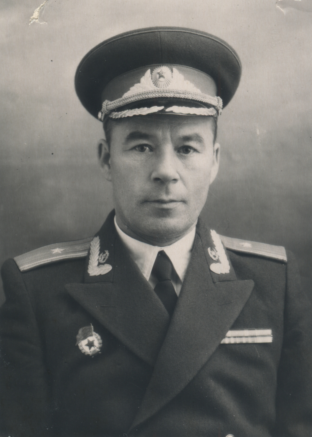 Офицер одной из частей бронетанковых войск Советской армии, по специальности относящийся к инженерным войскам и носящий соответствующие эмблемы на воротнике парадно-выходного мундира БТВ образца 1955 г. с черным бархатным воротником. Коллекция автора