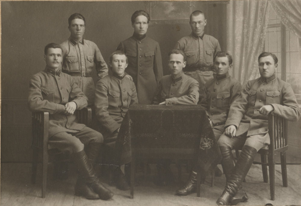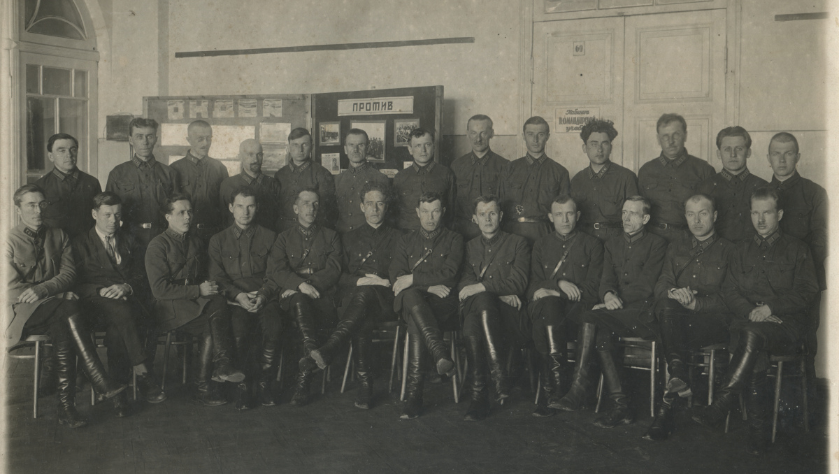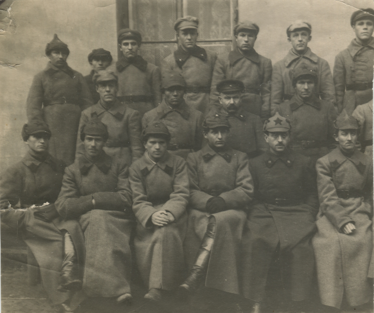 Кадр сослуживцев Ленинградской окружной военно-ветеринарной учебной кузницы. Петлицы в основном темно-зеленого цвета. Присутствует несколько ветеринарных значков. 26 октября 1925 г. Коллекция автора