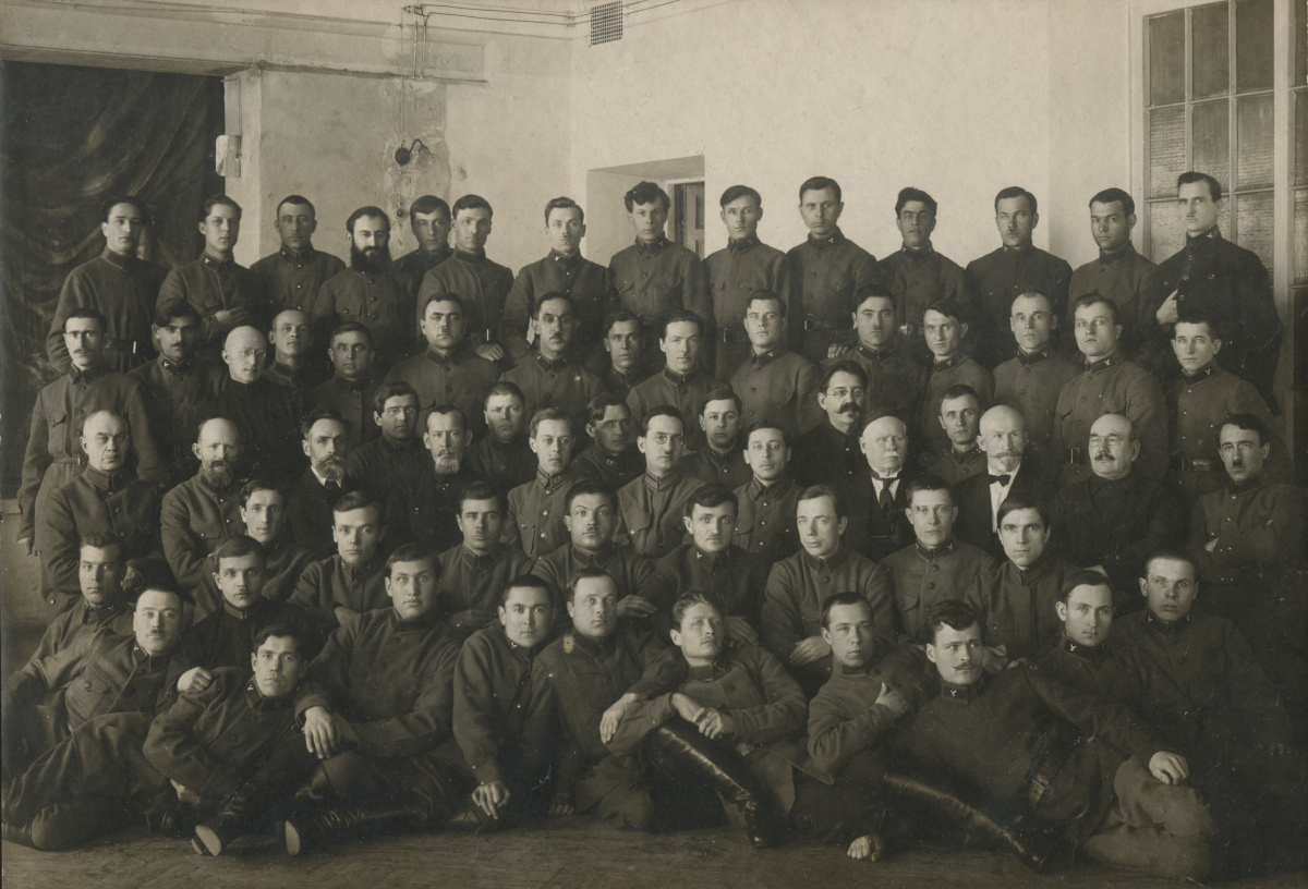 Слушатели или курсанты ветеринарного вуза, многие со значками на петлицах. Один из двух командиров со знаками различия 11-й категории (справа) - А.Е. Шпиллер - или начальник военно-ветеринарной школы или военрук Ленинградского государственного ветеринарного института. Коллекция автора