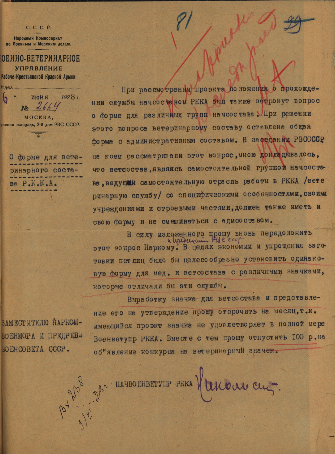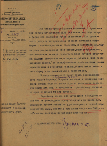 Отношение, направленное Военно-ветеринарным управлением РККА заместителю Наркомвоенмора и Предревовоенсовета СССР 6 июня 1928 г. (РГВА, ф. 4, оп. 1, д. 778, л. 81).