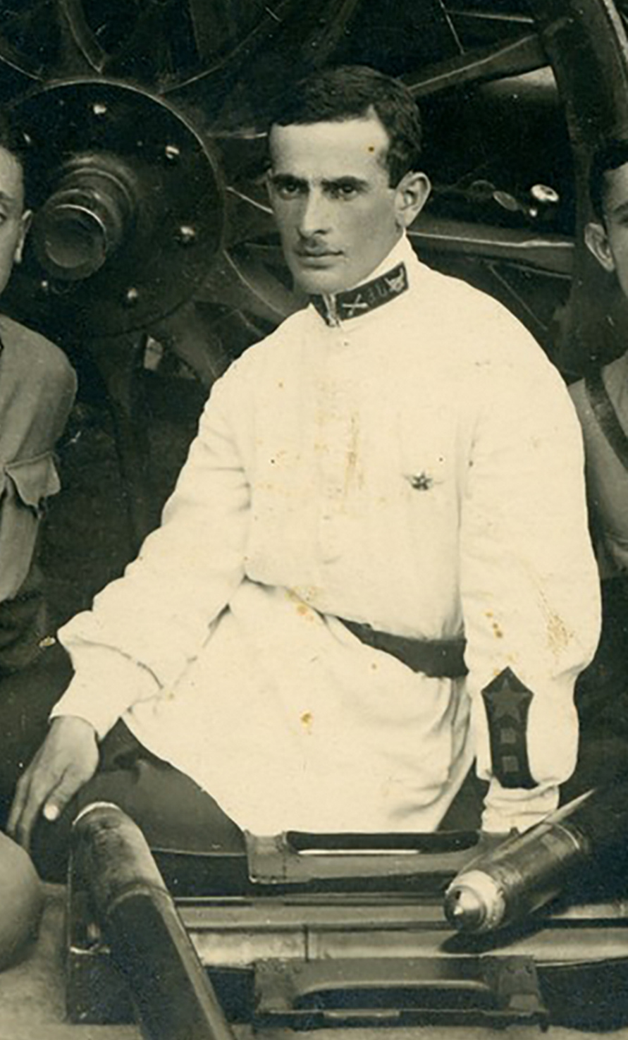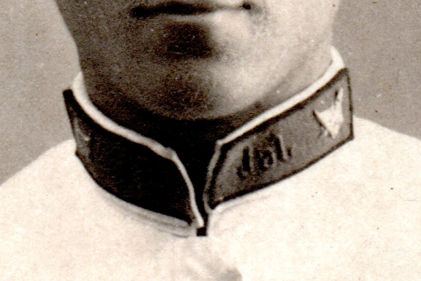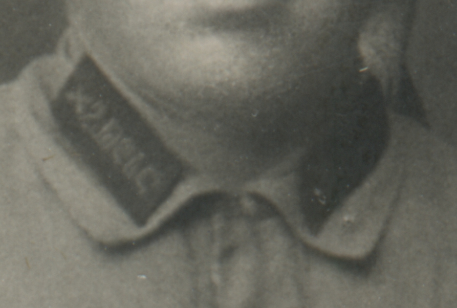Военнослужащий артиллерийского отделения Грузинской объединенной военной школы, разместивший на петлицах сразу два значка, артиллерийский и вузовский (оба формально отменены в 1924 году), между ними - литеры «ქს» (груз.ქართული სკოლა, то есть Грузинская школа). Выкадровка из группового снимка. 1924 год. Частная коллекция