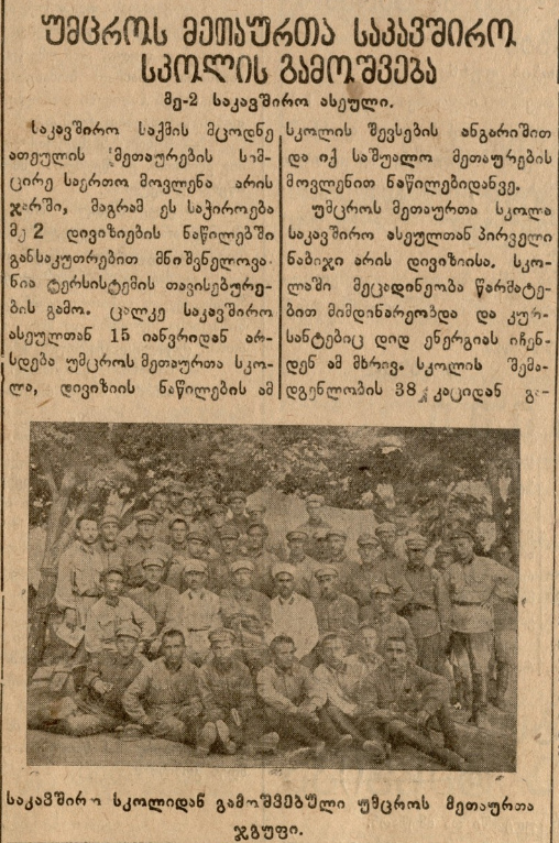Статья в газете «წითელი არმიელი» за 21 июня 1925 г., посвященная четырехлетию Грузинской объединенной военной школы. Подзаголовок статьи включает полное название школы по-грузински: «ქართული გაერთიანებული სამხედრო მეთაურთა სკოლა» (рус. Грузинская объединенная военная командная школа). Национальная библиотека парламента Грузии (https://dspace.nplg.gov.ge/)