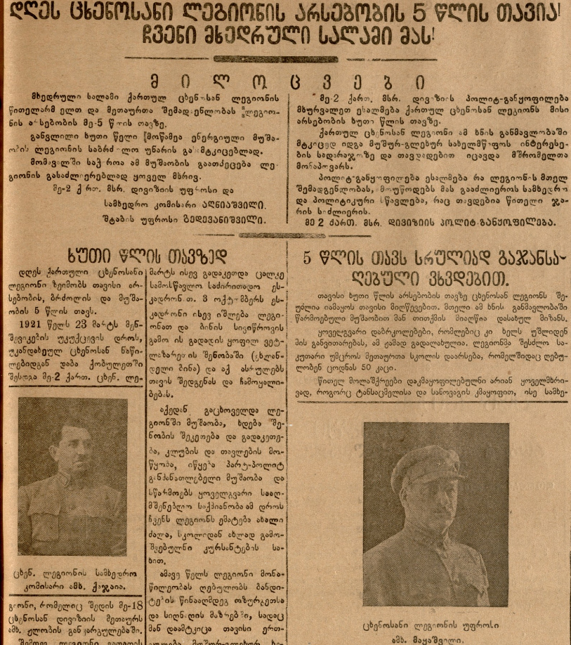 Статья в газете «წითელი არმიელი» за 30 апреля 1926 г., посвященная пятилетнему юбилею Грузинского кавалерийского полка и озаглавленная «დღეს ცხენოსანი ლეგიონის არსეᲑოᲑის 5 წლის თავია ჩვენი მᲮეᲓრᲣლი სალამი მას», где «ცხენოსანი ლეგიონი» означает кавалерийский полк. Национальная библиотека парламента Грузии (https://dspace.nplg.gov.ge/)