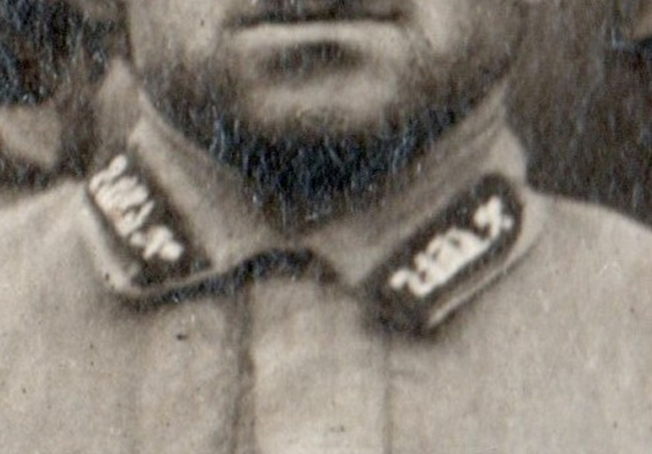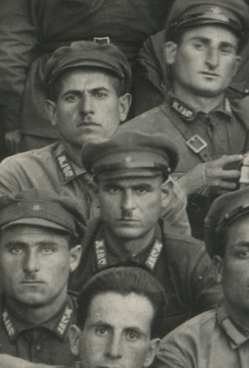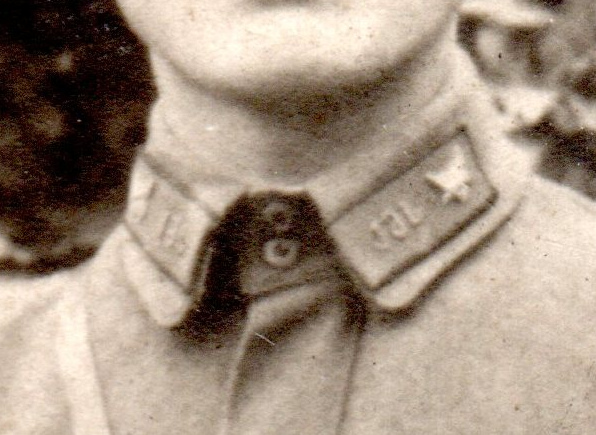 Военнослужащий Грузинской стрелковой дивизии с петличной шифровкой с аббревиатурой своего соединения «ქმდ» (груз. ქართული მსროლელი დივიზია), при этом со значком войск связи. Выкадровка из группового снимка командования Отдельной Кавказской армии (Кавказской Краснознаменной армии). Коллекция автора