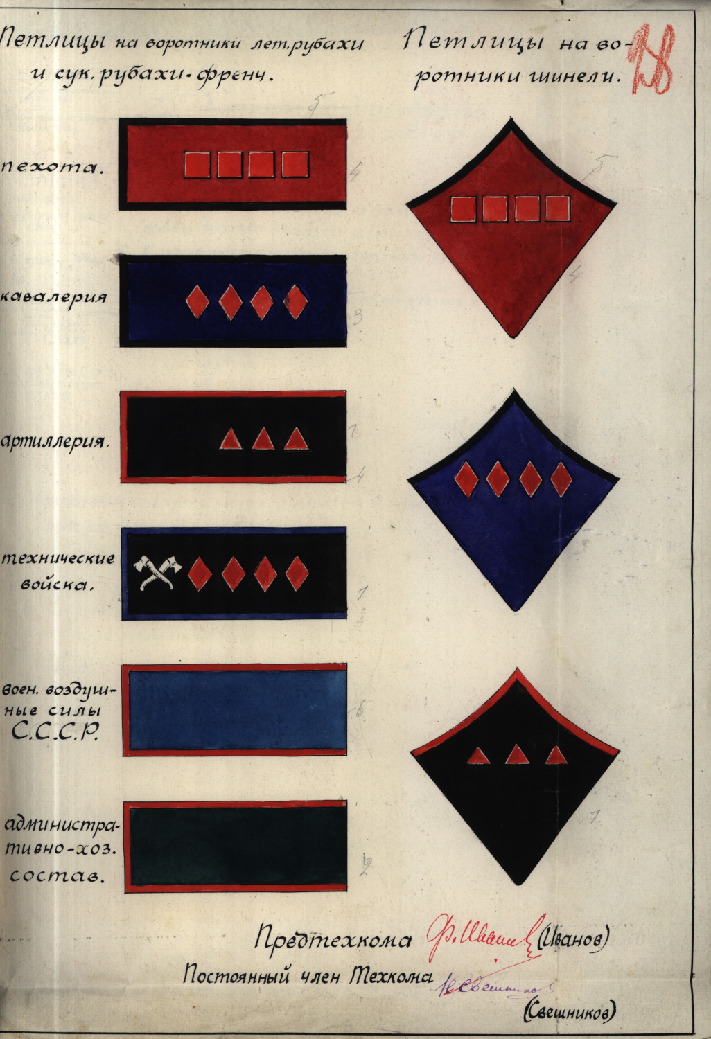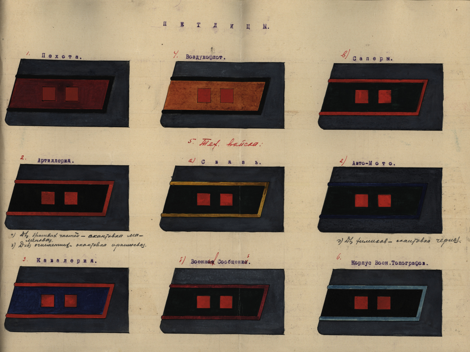 Комиссия на своем заседании признала желательным установить для петлиц родов войск РККА принципиально новую расцветку: [6]
