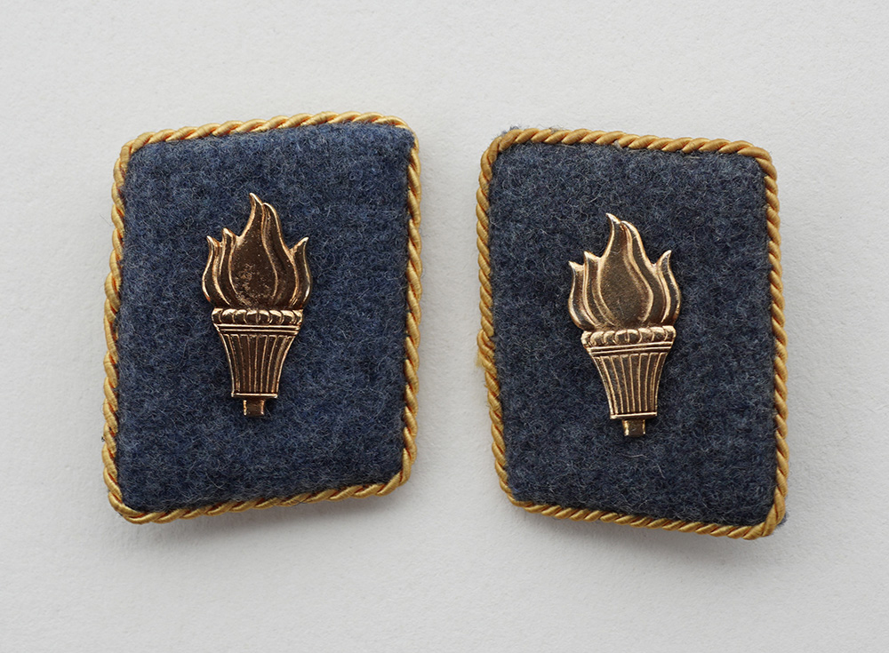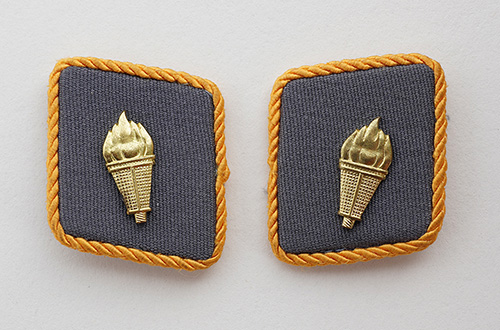 Эмблемы должны были изготавливаться из металла золотистого цвета и носиться на кителе, рубашке, пальто, шинели и ветровке. При этом указывалось, что эмблемы, кроме общего факела, должны были носиться над левым верхним карманом предметов обмундирования [35]. Факел размером 25 х 12 мм – на основах (петлицах) на воротнике.