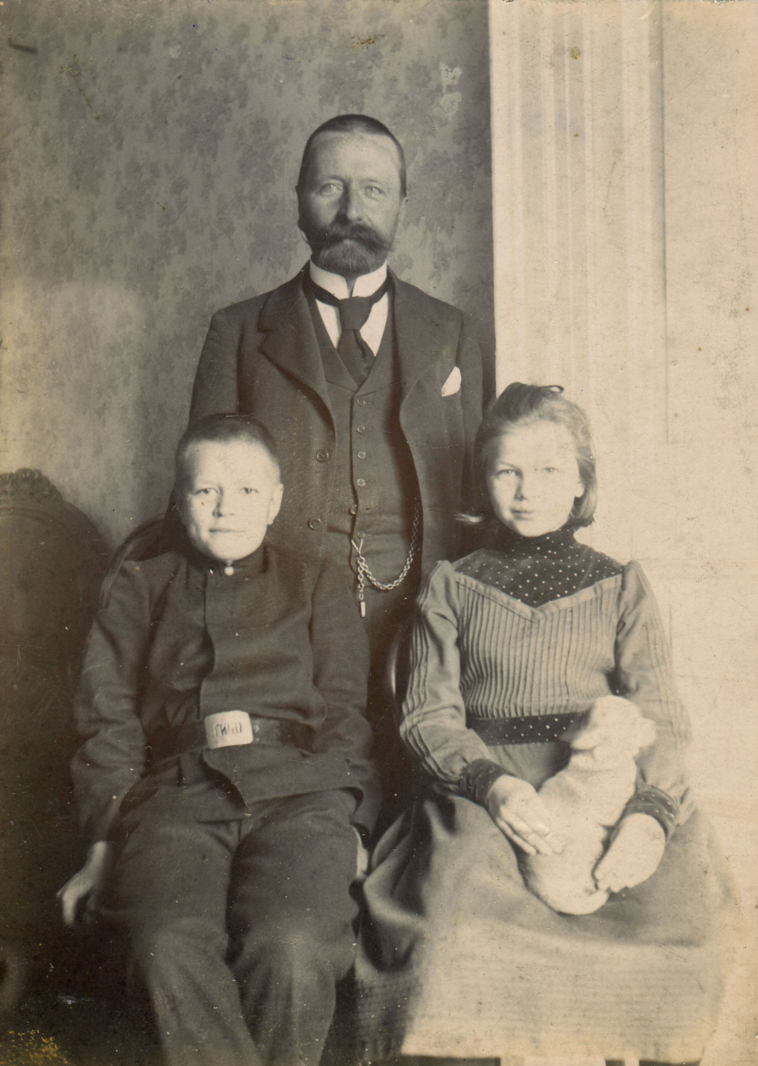 Рисунок 6. Учащийся гимназии Императорского Человеколюбивого общества [35] (г. Санкт-Петербург) Николай Вараксин с дядей Нилом Вараксиным и сестрой. Атрибуция согласно надписи на поясной пряжке и инскрипту на паспарту. Обращает на себя внимание отсутствие лиловой тесьмы на блузе, описанной в [25, C. 401]. Коллекция автора.