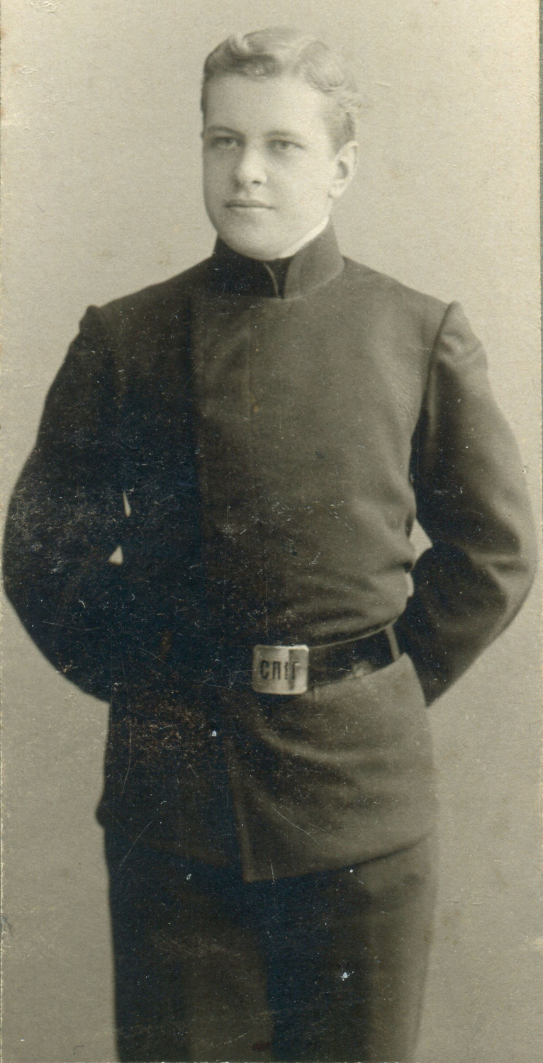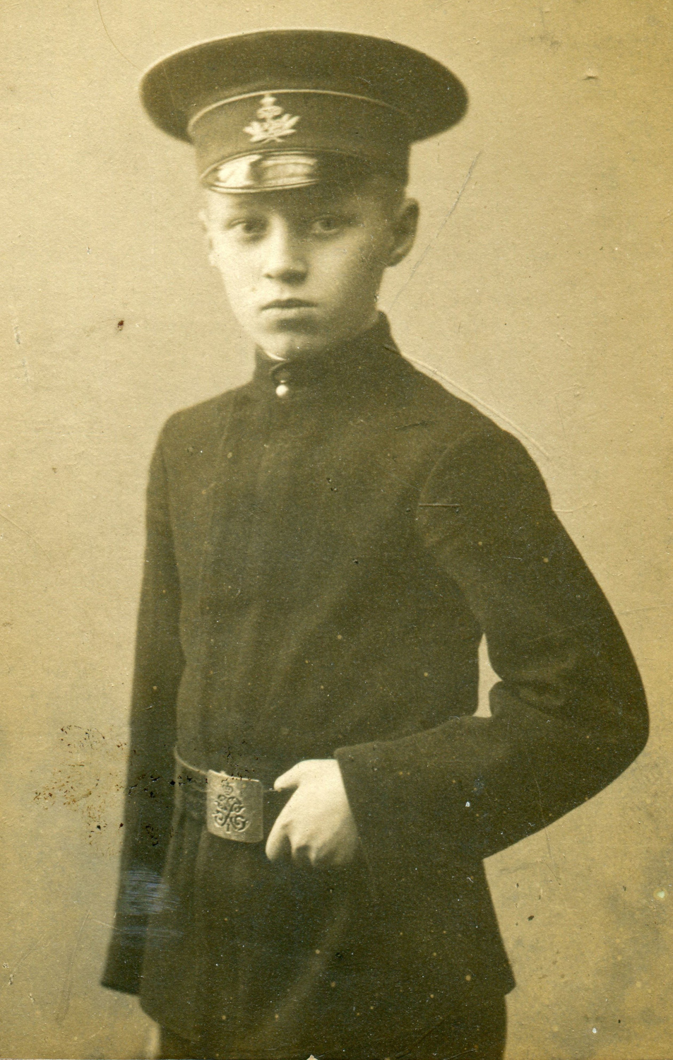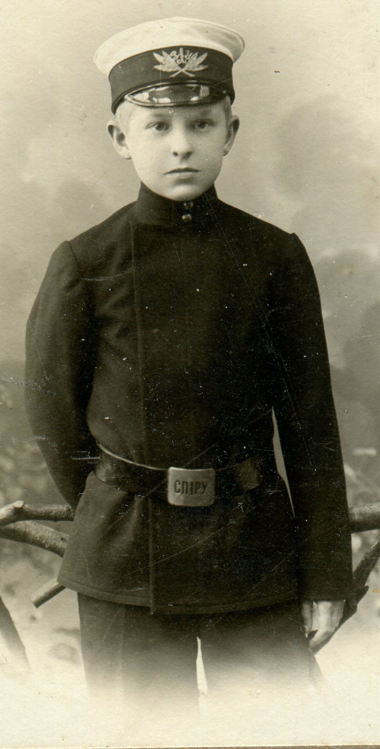 Рисунок 8. Учащийся Петроградской гимназии императора Петра Великого Сергей Лукьяненко (?). Атрибуция согласно форменным знакам на поясной пряжке и околыше фуражки [38]. Коллекция автора.