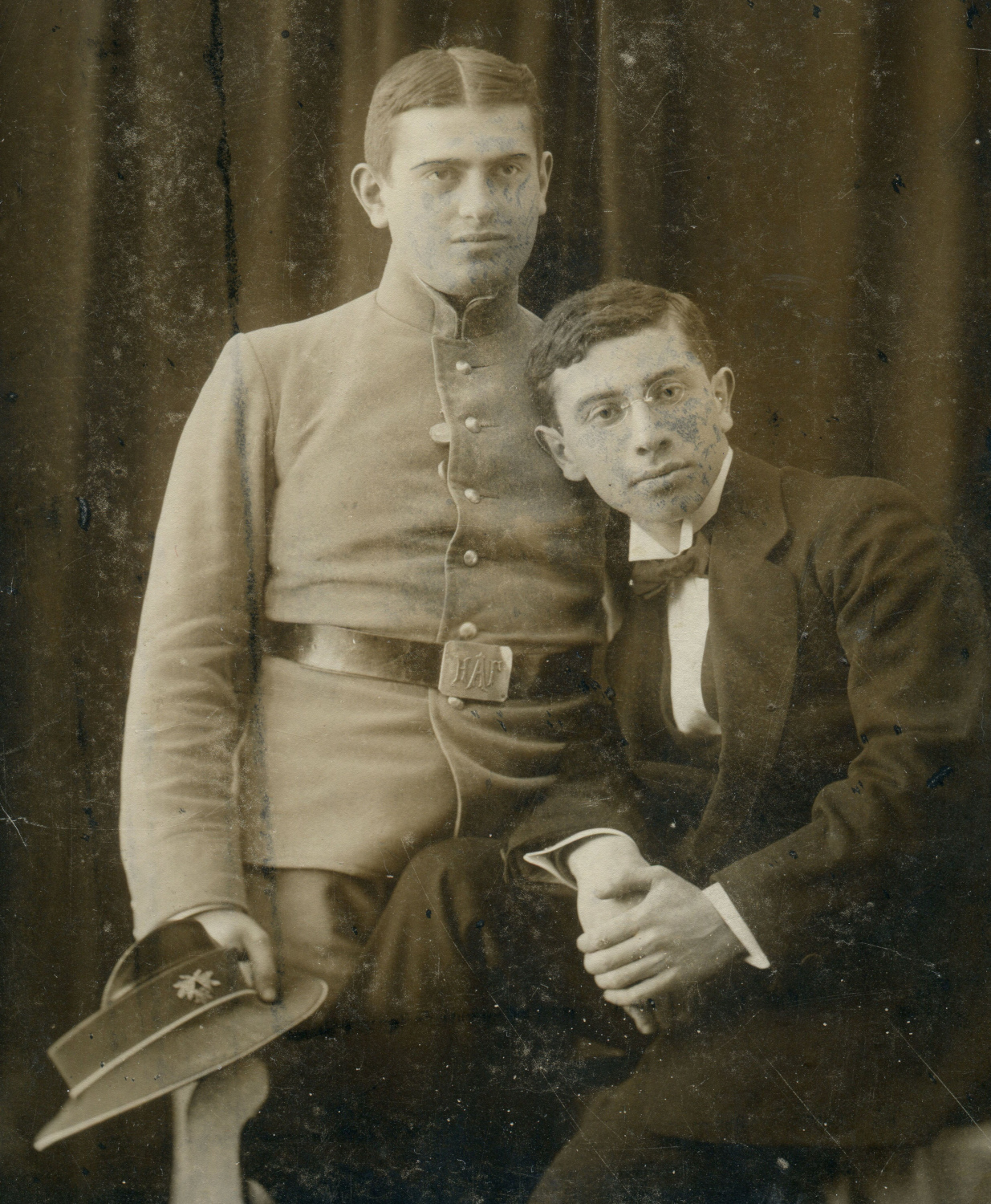 Рисунок 19. Учащийся Александровской гимназии (г. Николаев) в куртке произвольного образца (слева). 5 октября 1913 г. Атрибуция согласно надписи на поясной пряжке и инскрипту на обратной стороне фотографии. Коллекция автора.