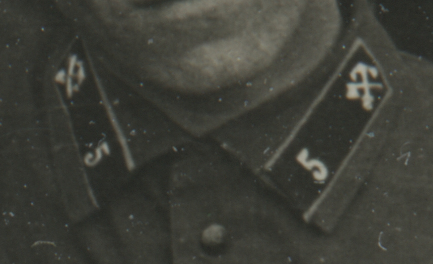 Металлическая эмблема на петлицах красноармейца 1-го железнодорожного полка Б. Алексеева установлена поверх прежней, выполненной краской по трафарету. Присутствует также номер полка («1»). Коллекция автора