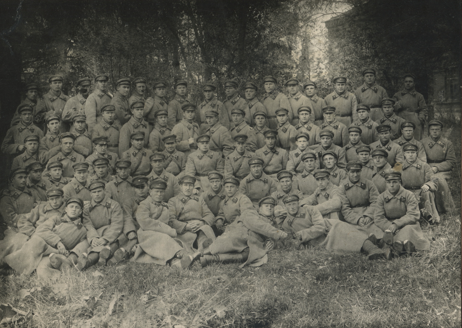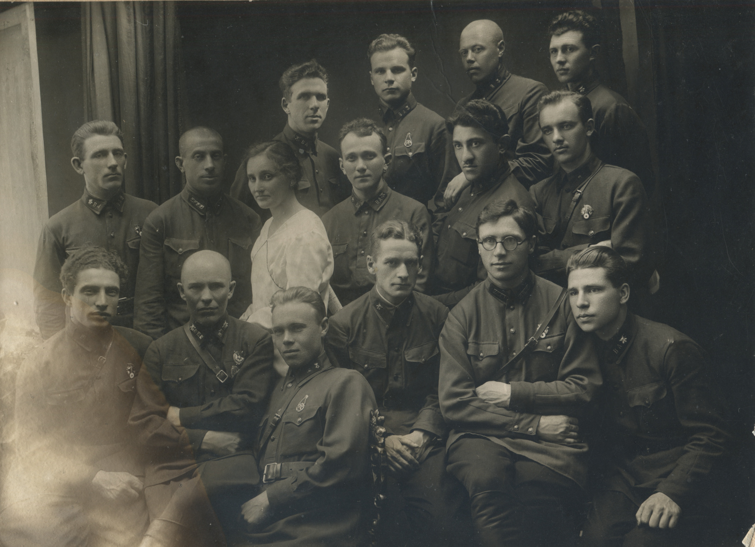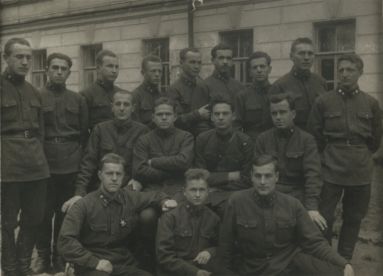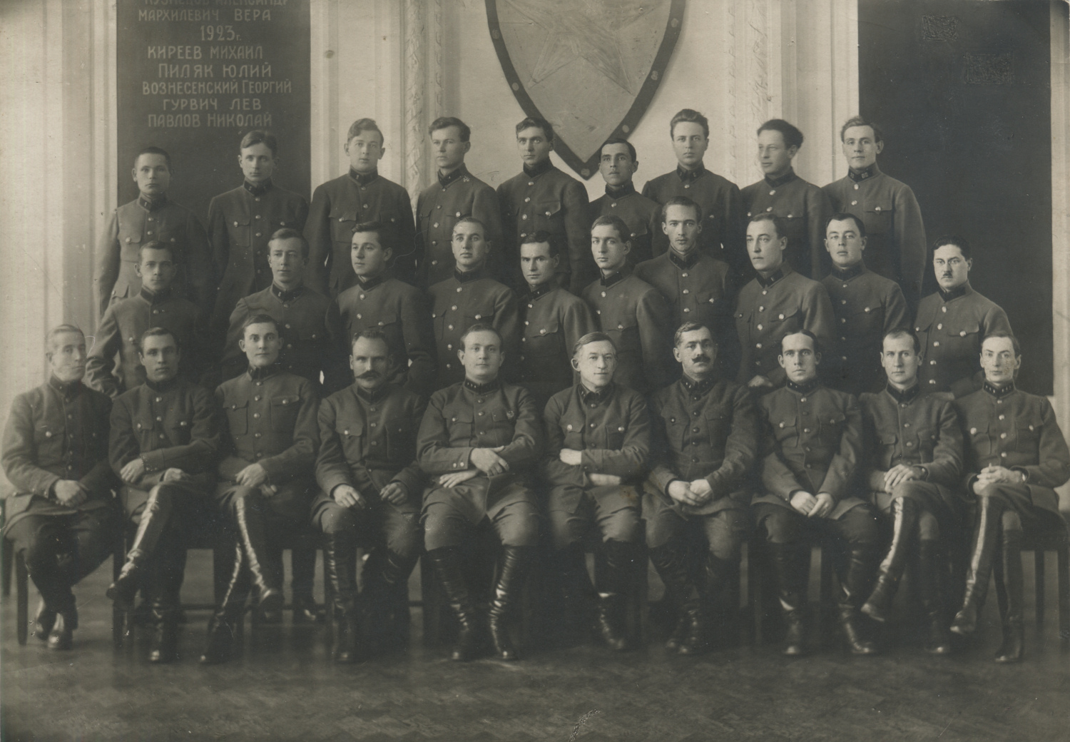 Слушатели Военно-химической академии РККА, сфотографировавшиеся по случаю окончания второго курса. Те, кто не имеют категории среднего или старшего начсостава, в большинстве своем носят на петлицах шифровку «ВА». Июль 1933 г. Коллекция автора