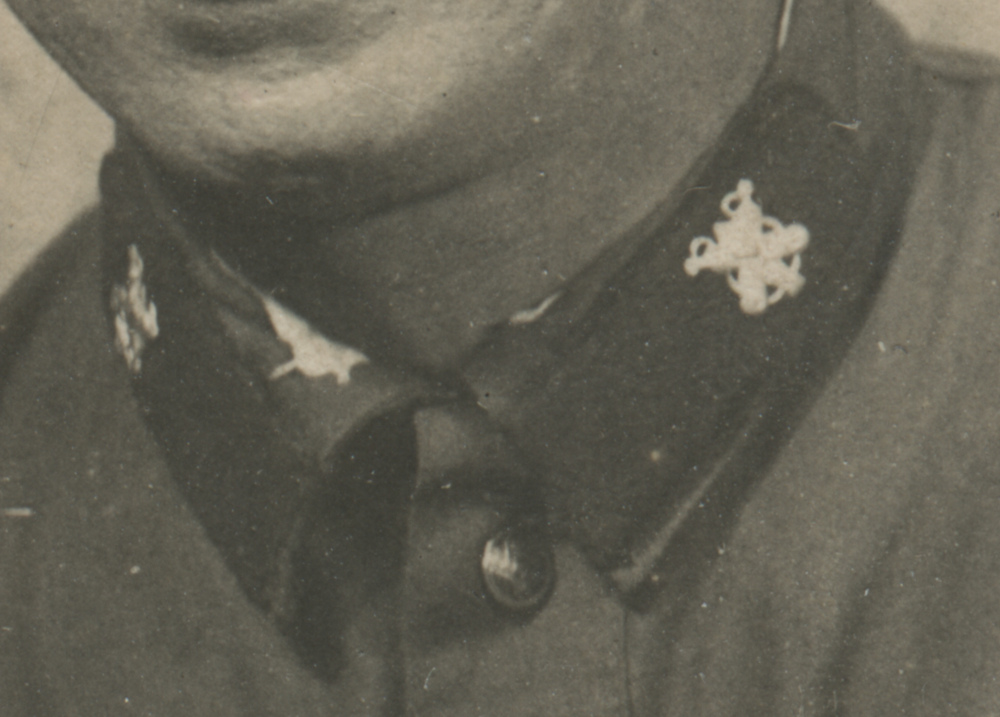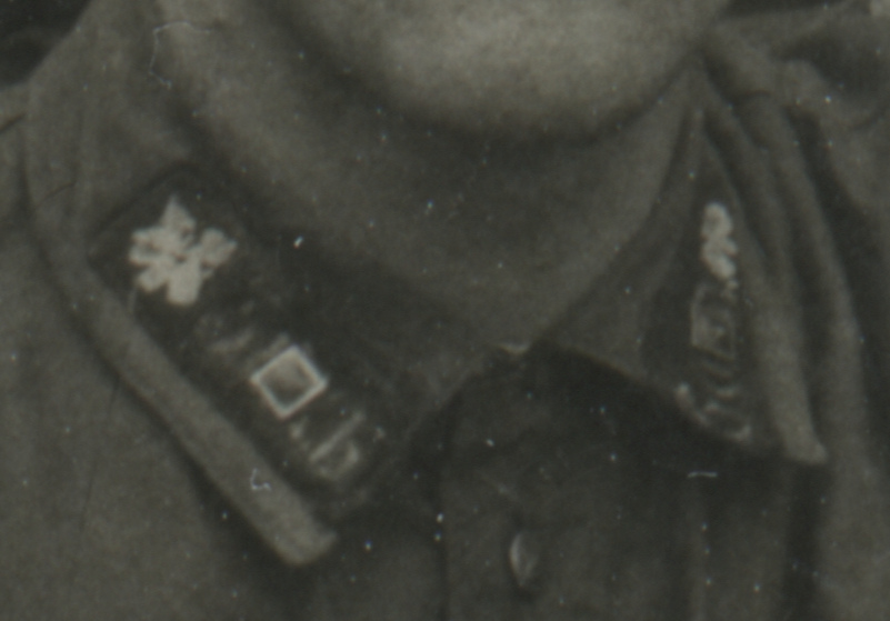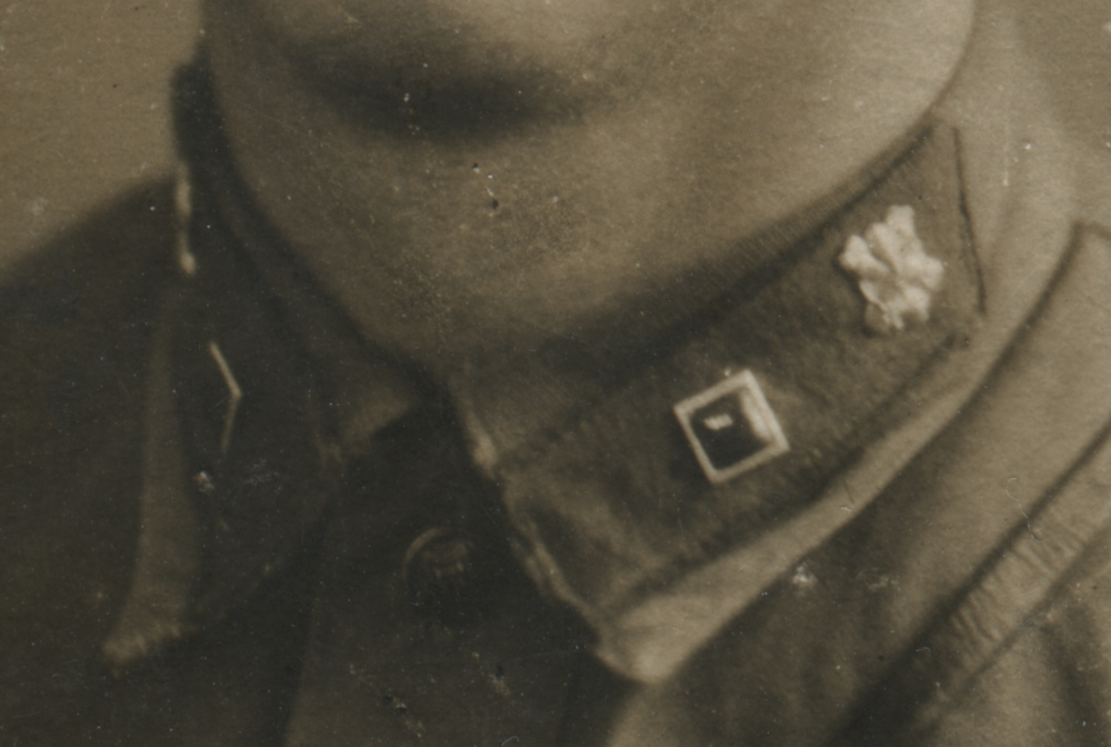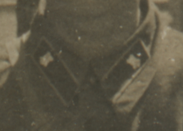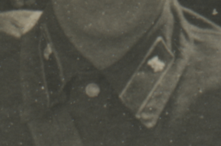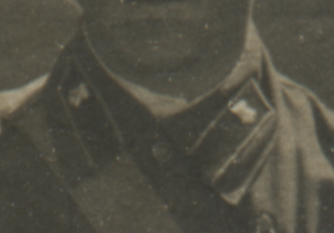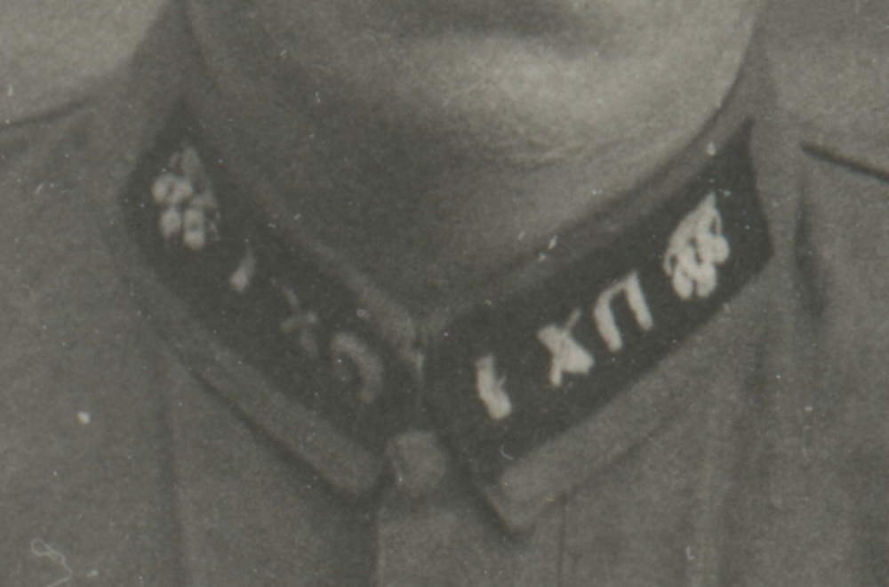 Снимок неизвестного командира демонстрирует редкую разновидность петличного значка химических частей («цельный рельефный»). Коллекция автора