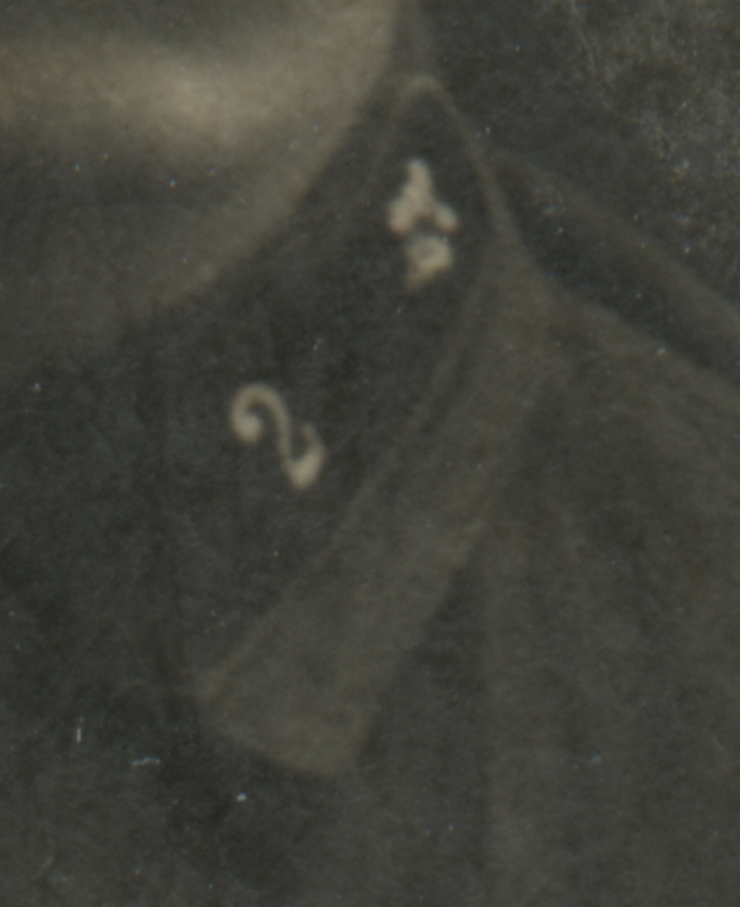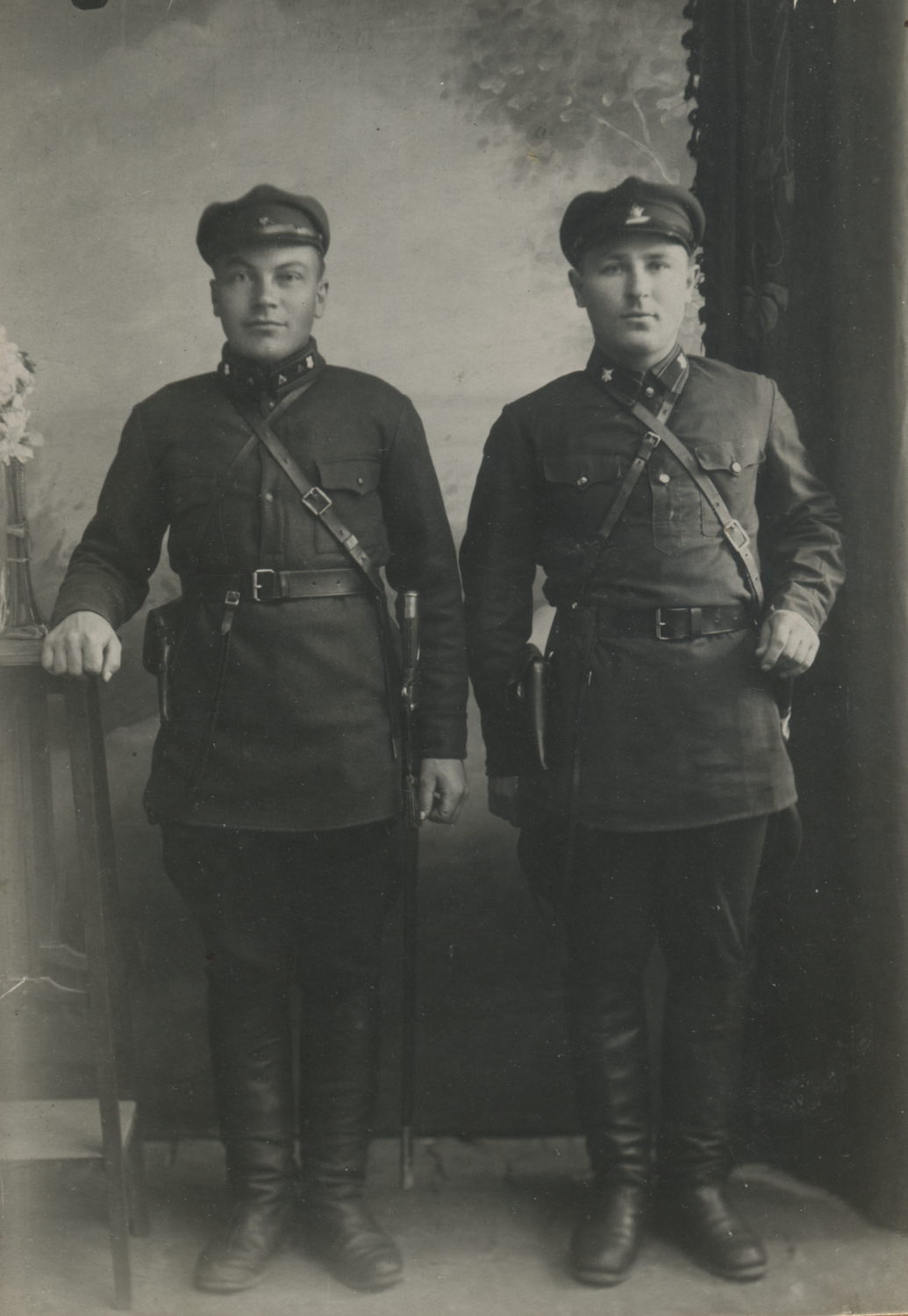 Военнослужащие 2-го отдельного химического батальона с шифровкой «2» на петлицах. Литеры выполнены из металла. Кант петлиц светлее черного поля. Ярославль, около 1931 г. Коллекция автора