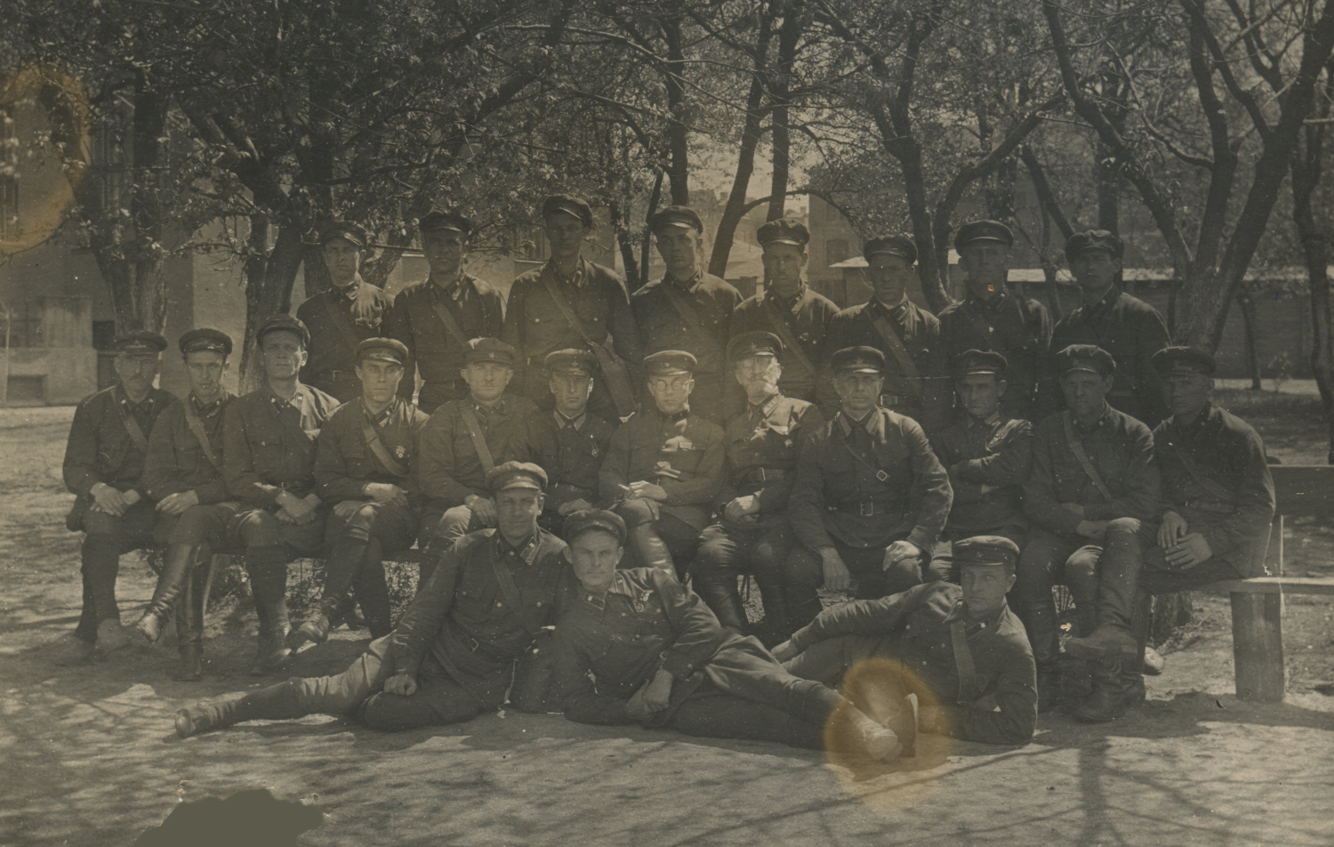 Судя по возрасту изображенных, на фото могут быть запечатлены сборы начсостава запаса. У большинства на рубахах - петлицы с черным полем и кантом светлого цвета (возможно синего), и эмблемой химических войск. Сидящий в центре начсостав в основном со светлыми общевойсковыми петлицами, кроме командира к-10 (черные с черным?). Не ранее 1933 г. Коллекция автора