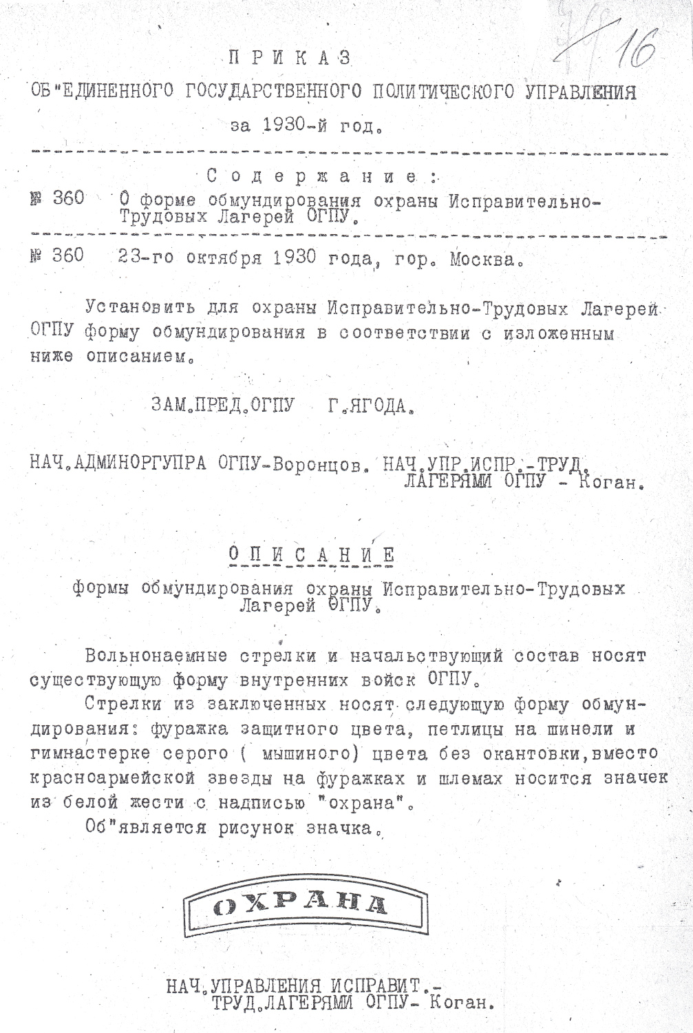 В фонде 9401 Государственного архива РФ хранится приказ ОГПУ № 360 от 23 октября 1930 года «О форме обмундирования охраны исправительно-трудовых лагерей ОГПУ».