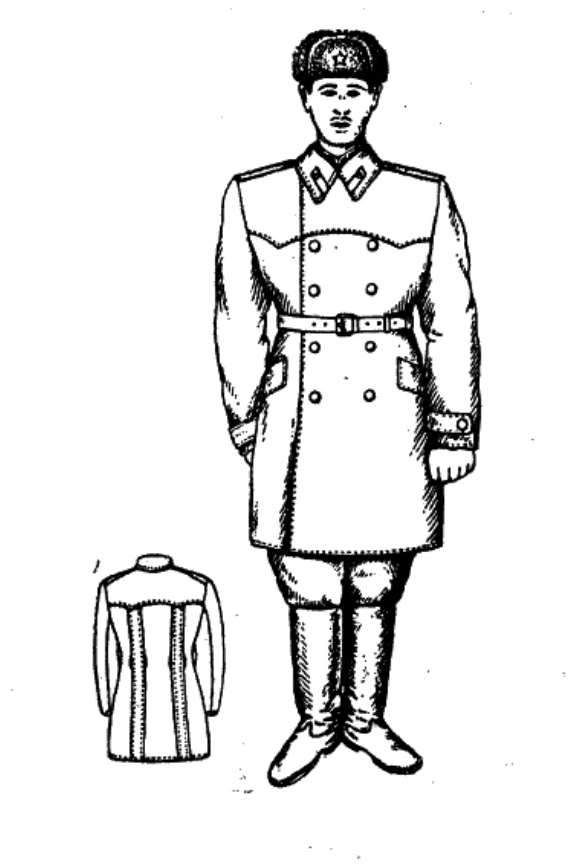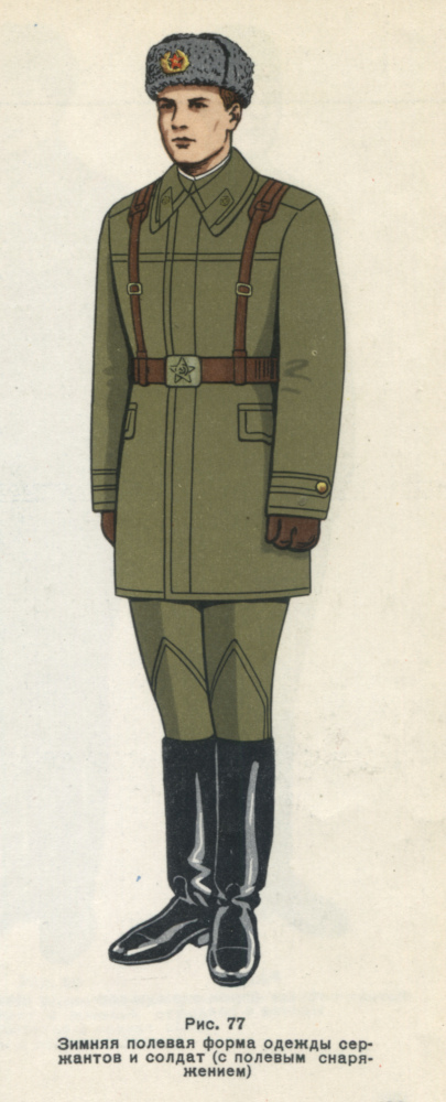 Необходимо отметить, что у большинства офицеров сухопутных войск ничего подобного солдатской ватной куртке не было и зимней одеждой при любой форме служила только шинель. Из исключений можно отметить офицеров, проходивших службу в особо холодных районах, там в инвентарь части отпускались телогрейка и шаровары ватные, а также офицеров военно-строительных отрядов, о которых мы расскажем ниже.