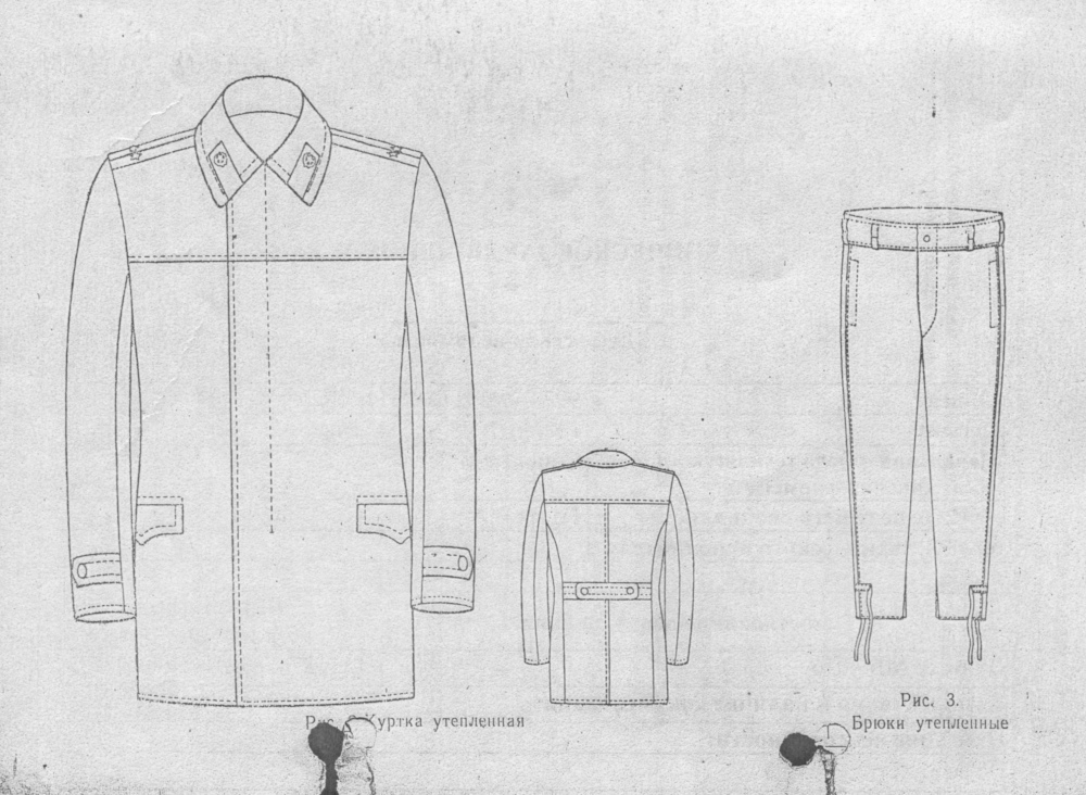 Как уже было сказано выше, первоначально утепленные куртки и брюки для офицеров, ватные куртки для военнослужащих срочной службы изготавливались согласно техническим заданиям № 3345 и № 3346, с некоторыми изменениями, принятыми техническим комитетом УВС МО СССР.