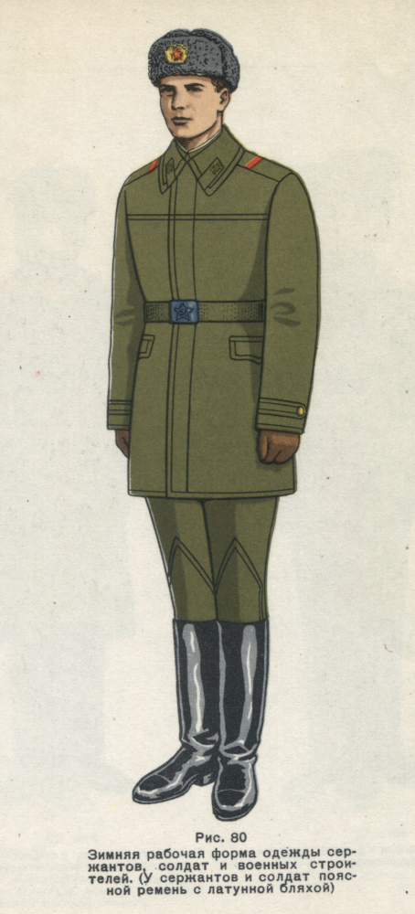 Параллельно, еще с 1958 года, на снабжение рабочих военно-строительных отрядов стала поступать эта же ватная двубортная куртка, но в качестве основного предмета выходного и рабочего обмундирования [20]. Отличительной особенностью курток военных строителей были знаки различия в виде ромбовидных петлиц черного цвета, нашиваемых на воротнике. Погоны рабочим ВСО, да и то для выходного обмундирования (с оставлением старых петлиц), были введены только в 1961 году [21]. В 1964 году ношение погон было распространено и на ватную куртку для рабочего обмундирования военных строителей [22]. В 1966 году военным строителям вместо ватной куртки для выходной формы одежды была введена шинель, аналогичная общеармейской [23].