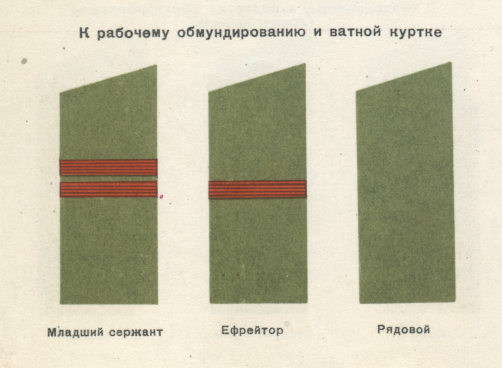 Рисунки погон к рабочему обмундированию и ватной куртке. Хорошо видны нашивки красного цвета, соответствующие воинским званиям. Правила ношения военной формы одежды (Приказ МО СССР № 250 от 1 ноября 1973 г.)