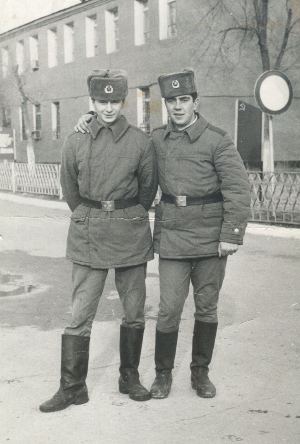 Рядовые Советской армии в ватных куртках образца 1966 г. Слева - с погонами старого образца, нашивными пятиугольными защитного цвета с золотистыми пуговицами и, вероятно, петлицами защитного цвета. Справа согласно правилам ношения 1969 г. - петлицы черные и погоны четырехугольные защитного цвета. Начало 1970-х гг. Коллекция автора