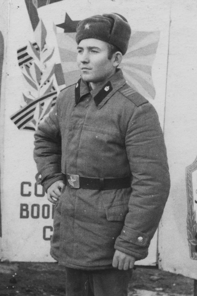 Военнослужащий Советской армии в ватной куртке. Знаки различия по правилам ношения 1973 г. - погоны и петлицы защитного цвета, но установлены эмблемы золотистого цвета вместо защитного. Коллекция автора
