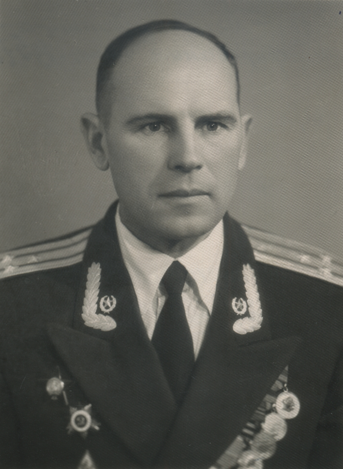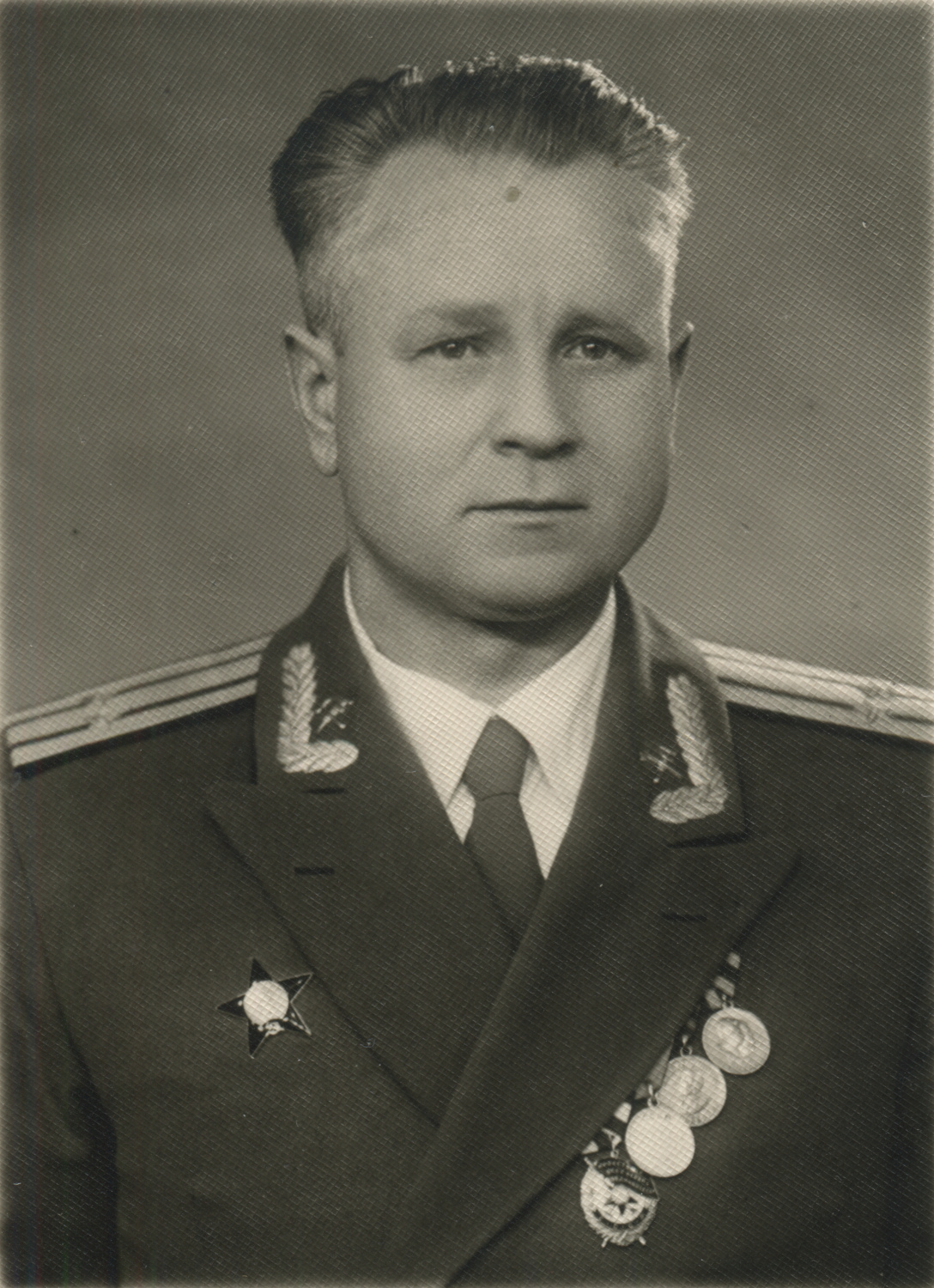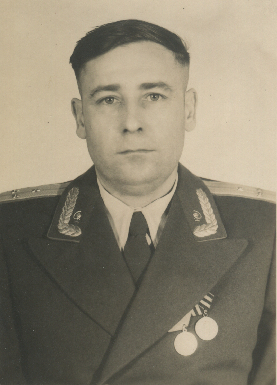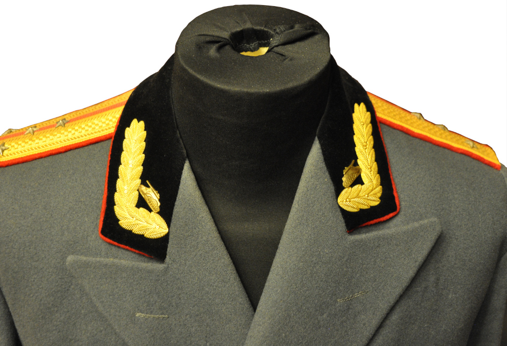 На воротнике парадно-выходного мундира полковника М.А. Клочкова вышитые орнамент и эмблемы, что встречалось довольно редко. Выборг, 1958 г. Коллекция автора