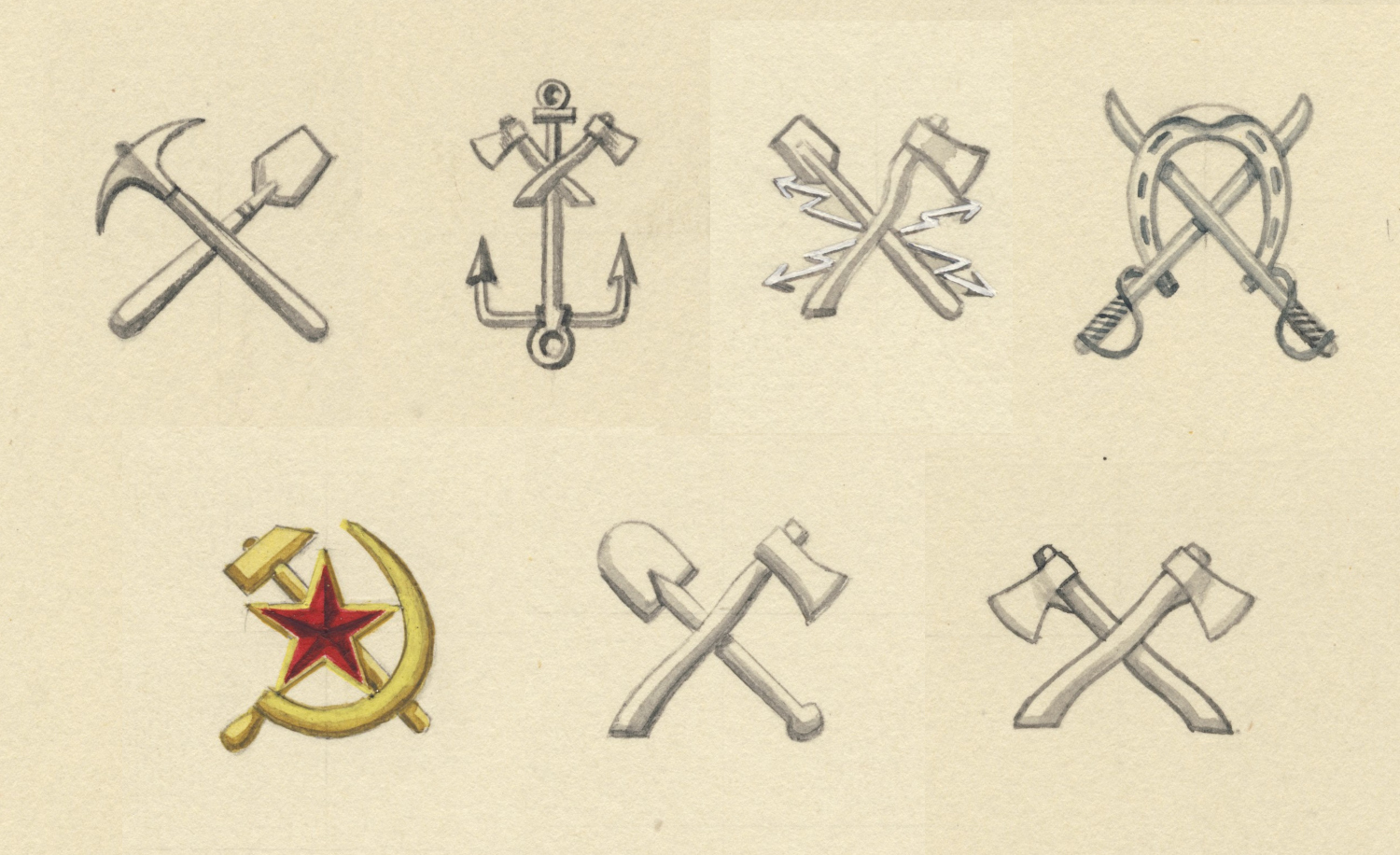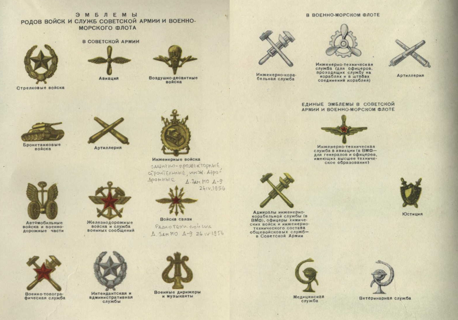 Рисунки эмблем родов войск и служб из типографского издания правил ношения военной формы одежды маршалами Советского Союза, адмиралами Флота Советского Союза, маршалами, генералами, адмиралами и офицерами Советской Армии и Военно-Морского Флота на мирное время (Приказ МО СССР № 105 от 30 июня 1955 г.).