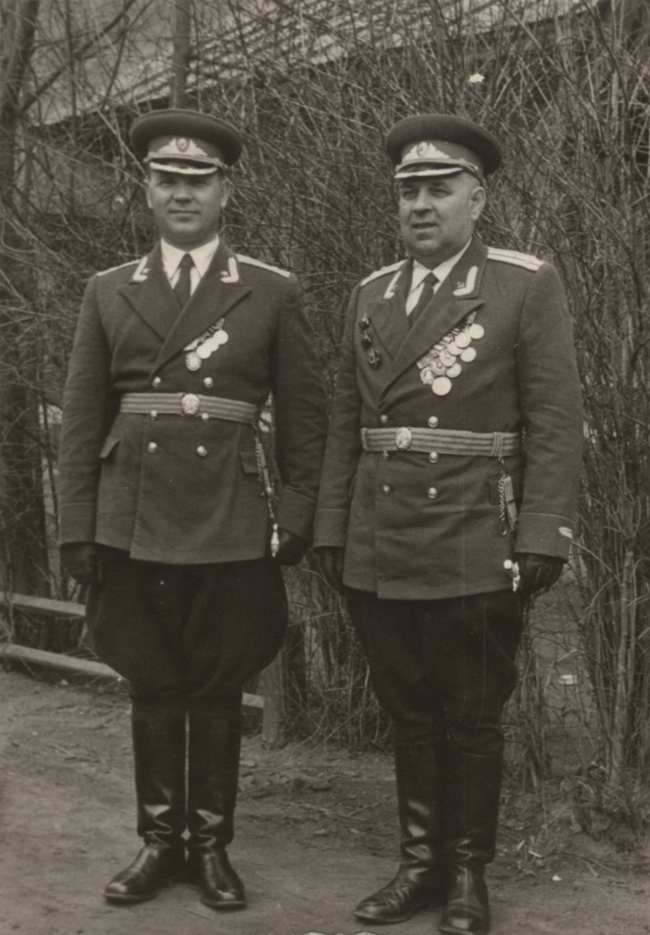 Офицеры Советской армии в недавно пошитых мундирах, участвующие в праздничных мероприятиях 1 мая 1955 г. На воротнике полковника слева - погонные звездочки старшего офицерского состава, справа - интендантские эмблемы образца 1940/42 г. Коллекция автора