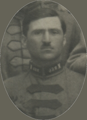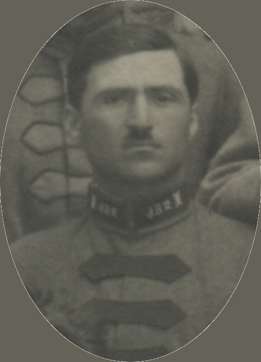 Военнослужащий артиллерийского отделения Грузинской объединенной военной школы, разместивший на петлицах сразу два значка, артиллерийский и вузовский (оба формально отменены в 1924 году), между ними - литеры «ქს» (груз.ქართული სკოლა, то есть Грузинская школа). Выкадровка из группового снимка. 1924 год. Частная коллекция