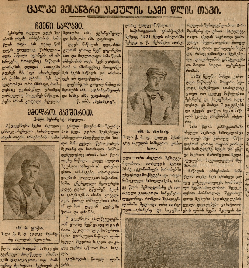 Статья в газете «წითელი არმიელი» за 6 декабря 1925 г., посвященная трехлетнему юбилею отдельной саперной роты 1-й Грузинской стрелковой дивизии и озаглавленная «ცალკე მესანგრე ასეულის სამი წლის თავი», где «ცალკე მესანგრე ასეული» - это отдельная саперная рота по-грузински. Национальная библиотека парламента Грузии (https://dspace.nplg.gov.ge/)