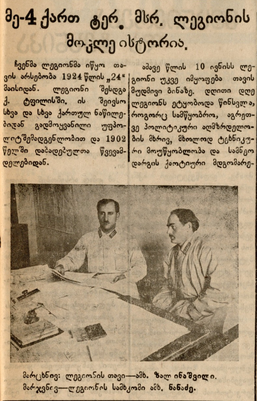 Статья в газете грузинских национальных частей РККА «წითელი არმიელი» («Красноармеец») за 20 сентября 1925 г. «ᲛᲔ-4 ქართ. ᲢᲔრ. ლეგიონის მოქლე ისᲢორია» с краткой историей 4-го полка 2-й Грузинской стрелковой дивизии в честь его первой годовщины. Полк назван (сокращения развернуты) «მე-4 ქართული ტერიტორიული მსროლელი ლეგიონი», то есть 4-м Грузинским территориальным стрелковым полком. Национальная библиотека парламента Грузии (https://dspace.nplg.gov.ge/)