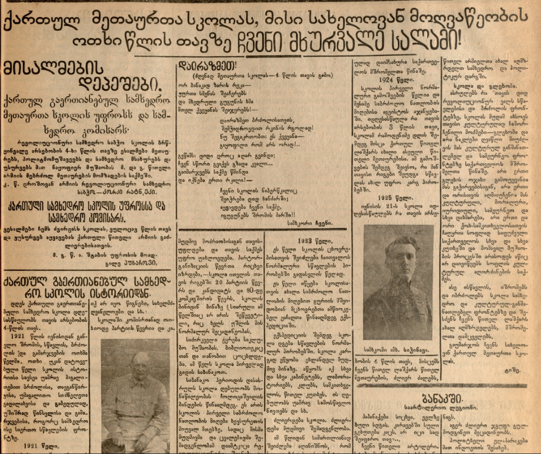 Статья в газете «წითელი არმიელი» за 21 июня 1925 г., посвященная четырехлетию Грузинской объединенной военной школы. Подзаголовок статьи включает полное название школы по-грузински: «ქართული გაერთიანებული სამხედრო მეთაურთა სკოლა» (рус. Грузинская объединенная военная командная школа). Национальная библиотека парламента Грузии (https://dspace.nplg.gov.ge/)