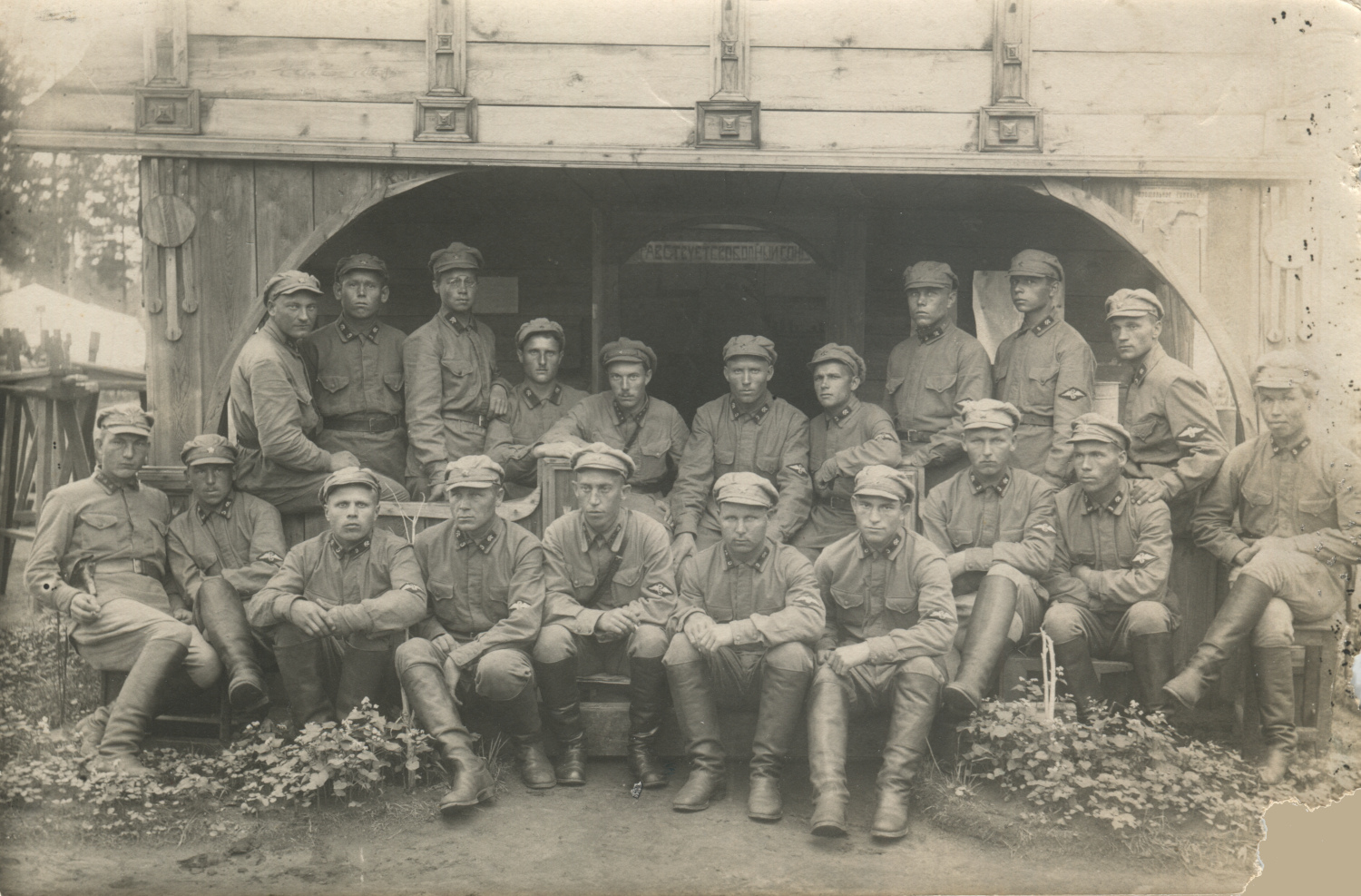 Личный состав 9-го железнодорожного полка. У всех военнослужащих на петлицах значки № 9 - у командиров со знаками различия, а у красноармейцев с шифровкой полка («9»). Большинство имеет также нарукавный знак образца 1919/22 гг. Коллекция автора