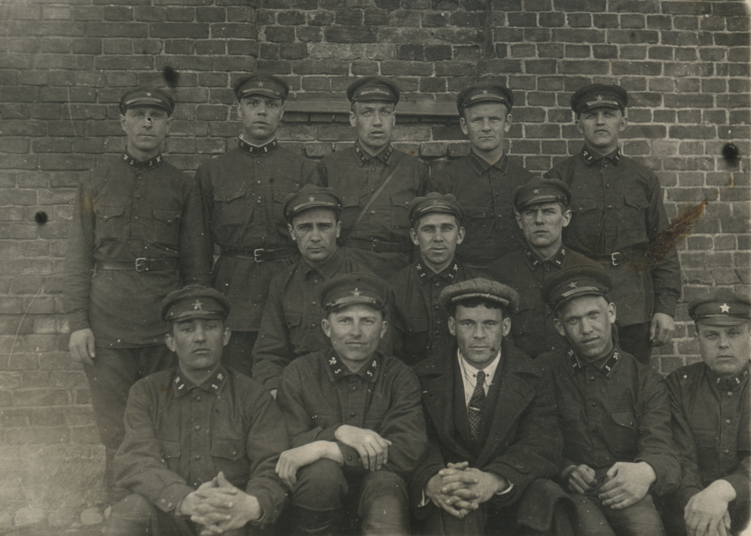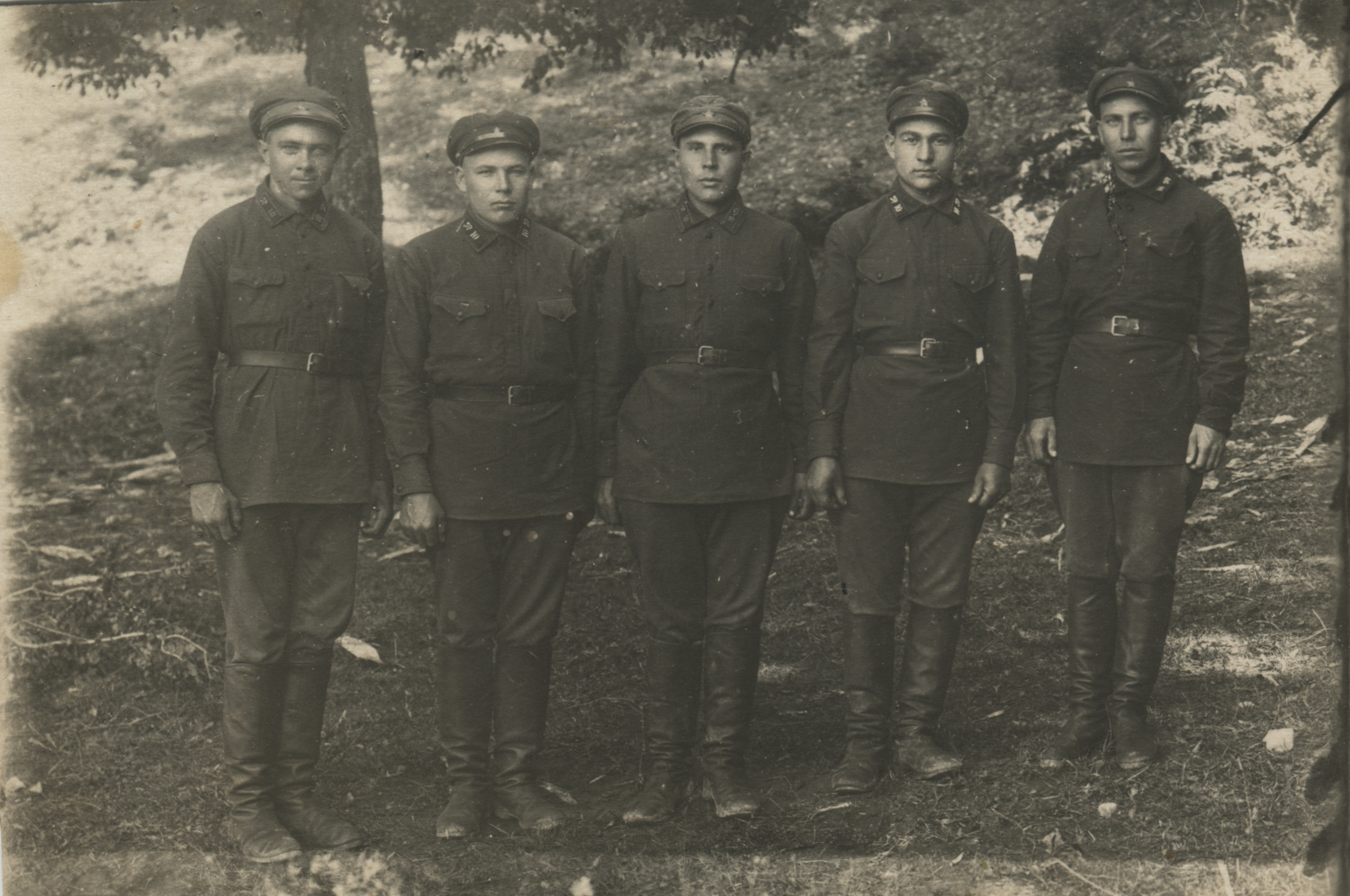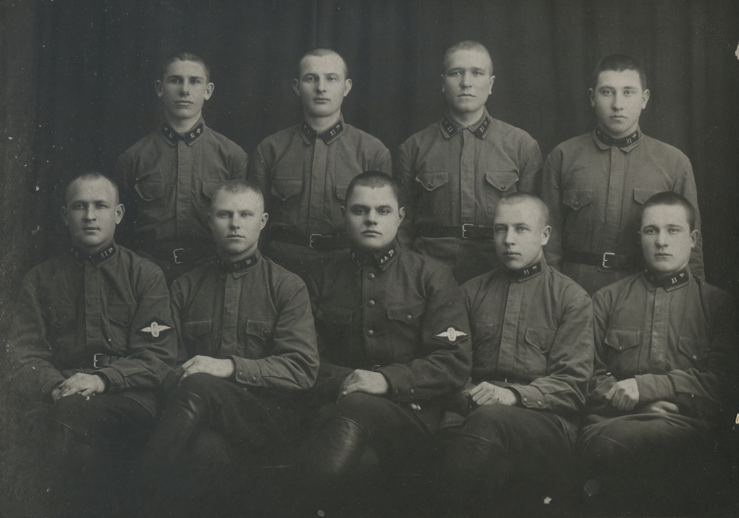 Снимок предположительно атрибутирован как изображающий красноармейцев и младших командиров 5-го железнодорожного полка РККА. На петлицах встречается шифровка «5» и значки № 9 в самом разном исполнении. Коллекция автора