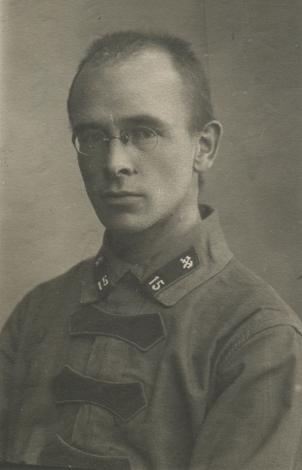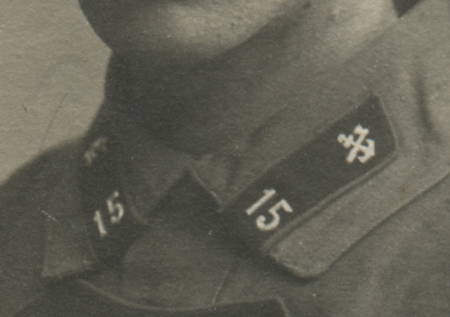 Военнослужащий 15-го железнодорожного батальона в форме одежды 1922 г. с петличной шифровкой «15» (развернутой на 90 градусов) и значком № 20 (согласно приказу РВСР № 322 от 31 января 1922 г.). Подписано в сентябре 1924 г. Коллекция автора