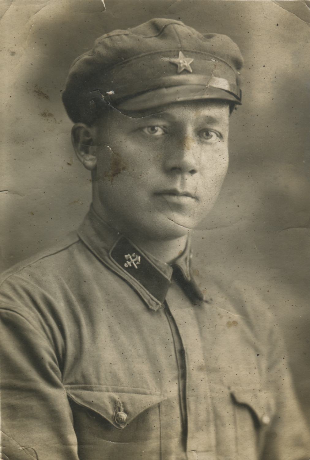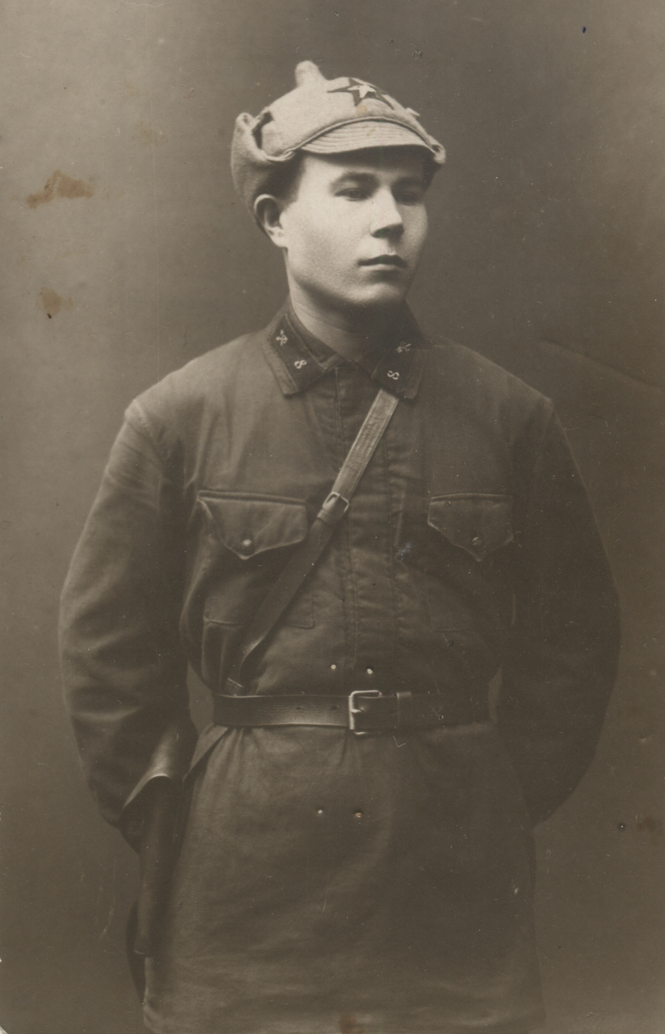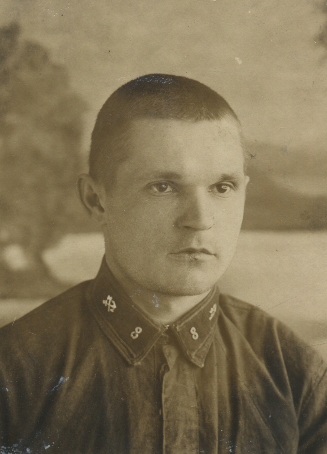 Неизвестный красноармеец 8-го железнодорожного полка. На его петлицах шифровка «8» и значки выполнены краской по трафарету. Рязань, б/д. Коллекция Николая Жуковского