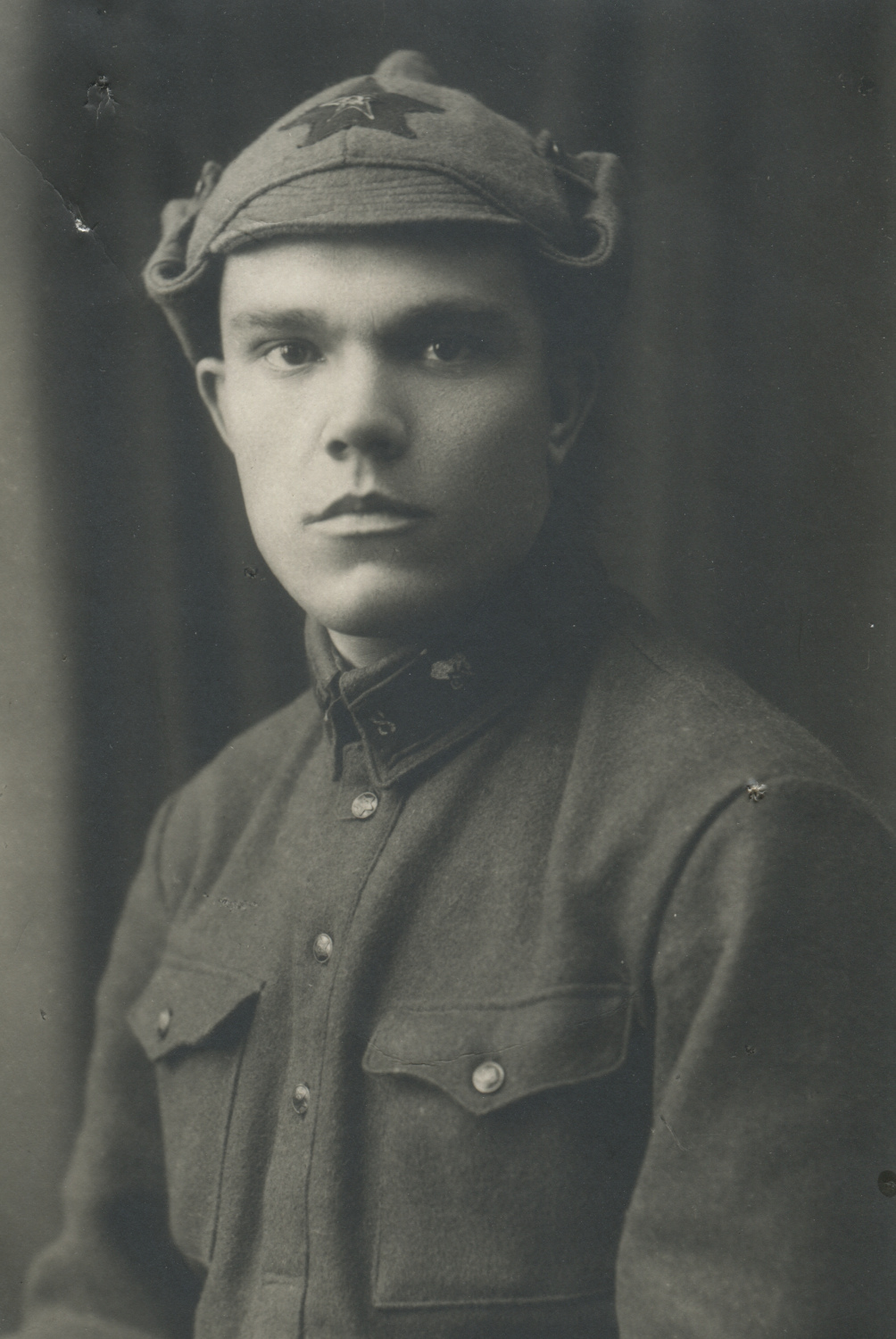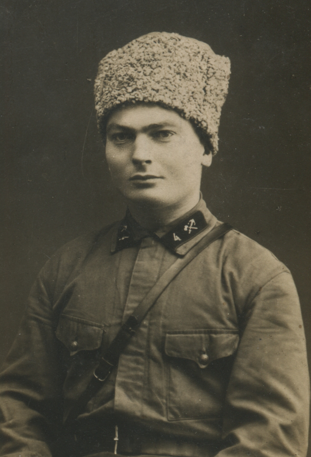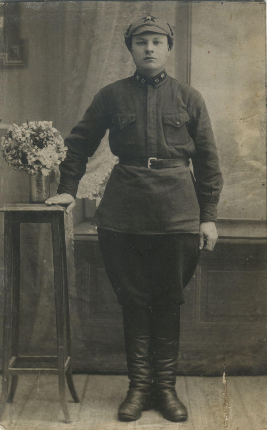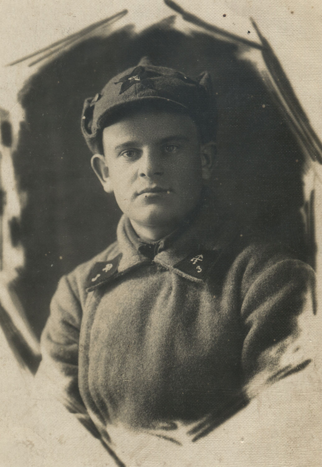 Неизвестный красноармеец 8-го железнодорожного полка. На его петлицах шифровка «8» и значки выполнены краской по трафарету. Рязань, б/д. Коллекция Николая Жуковского