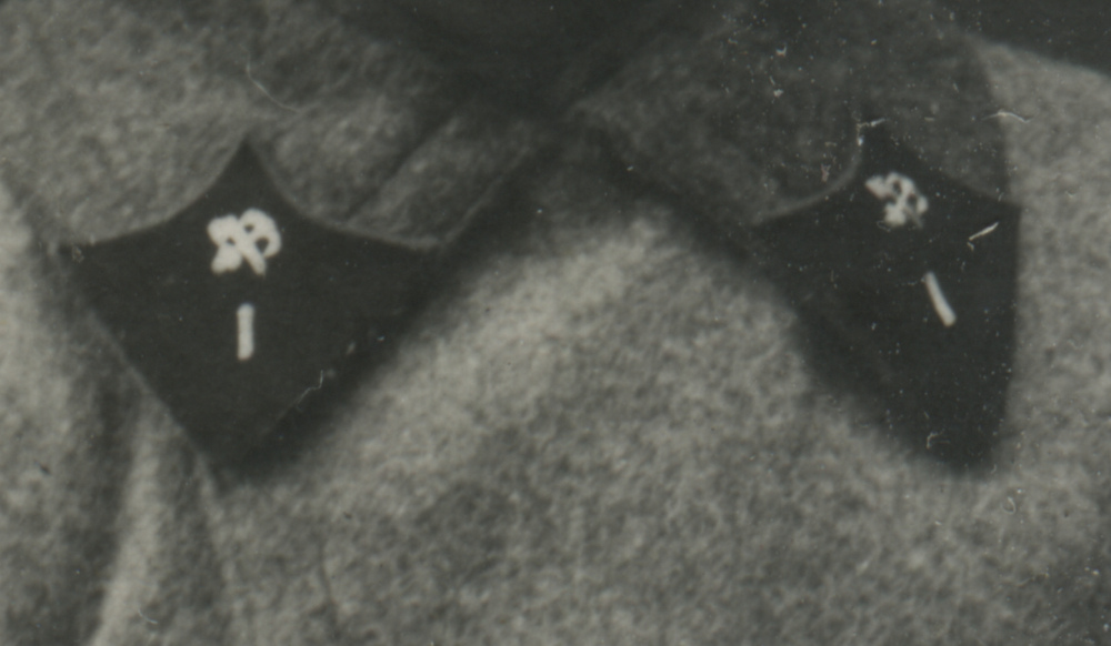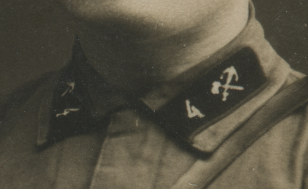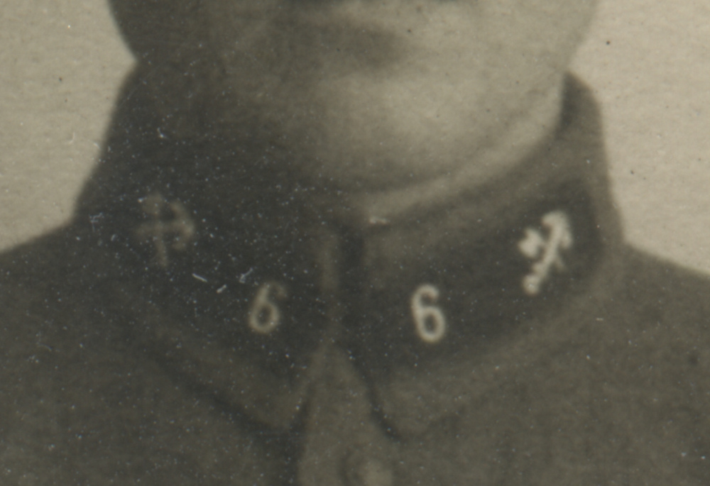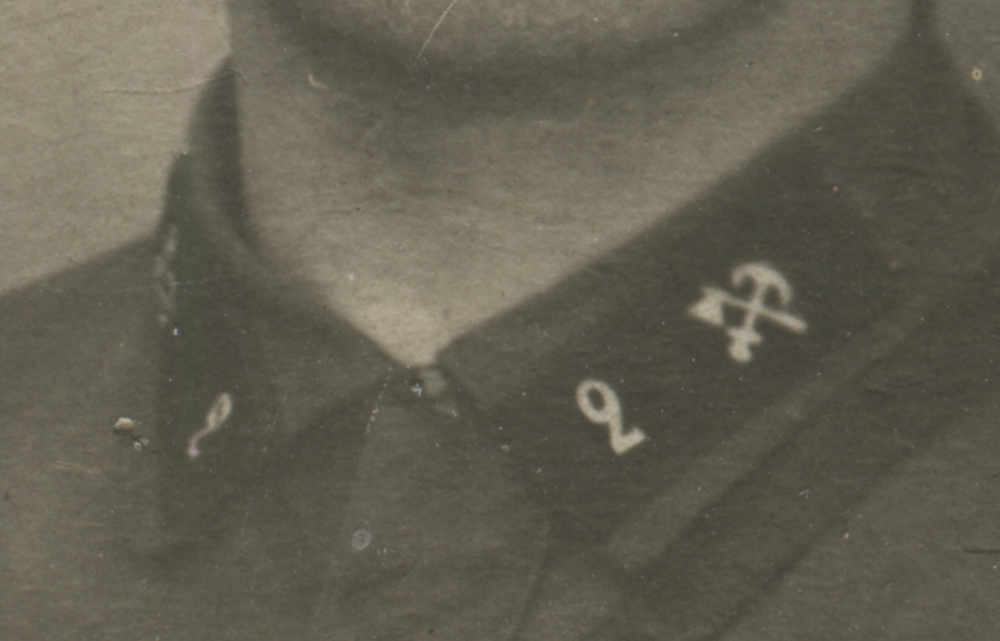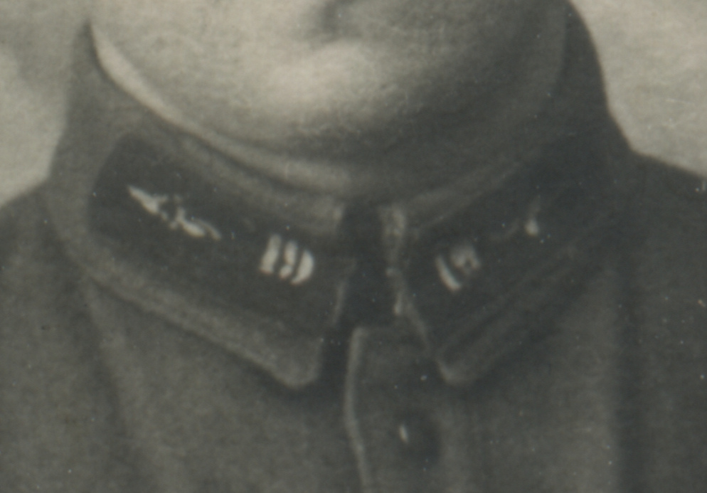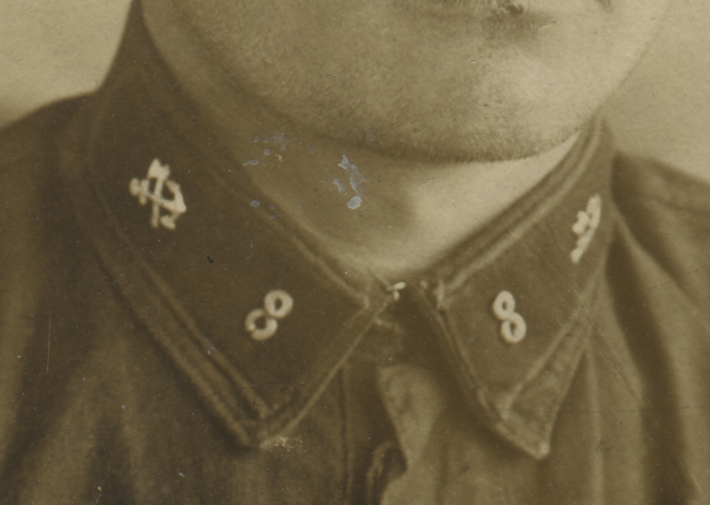 Металлическая эмблема на петлицах красноармейца 1-го железнодорожного полка Б. Алексеева установлена поверх прежней, выполненной краской по трафарету. Присутствует также номер полка («1»). Коллекция автора