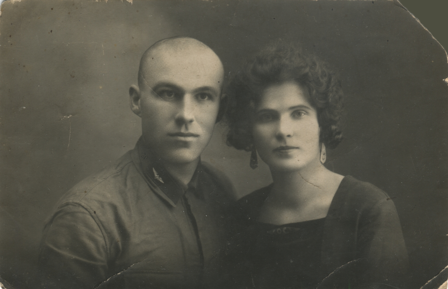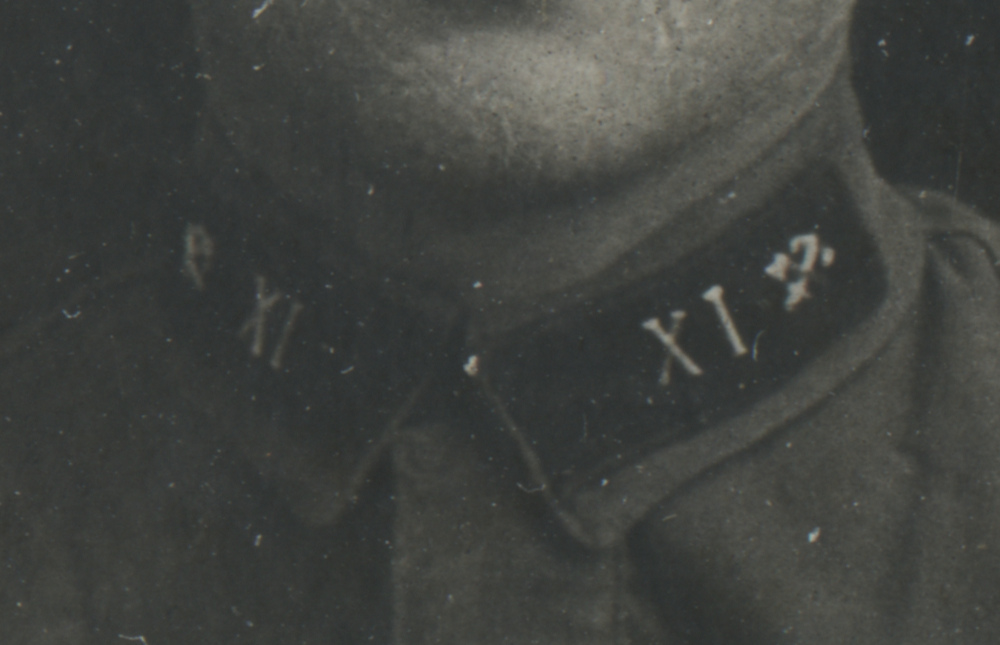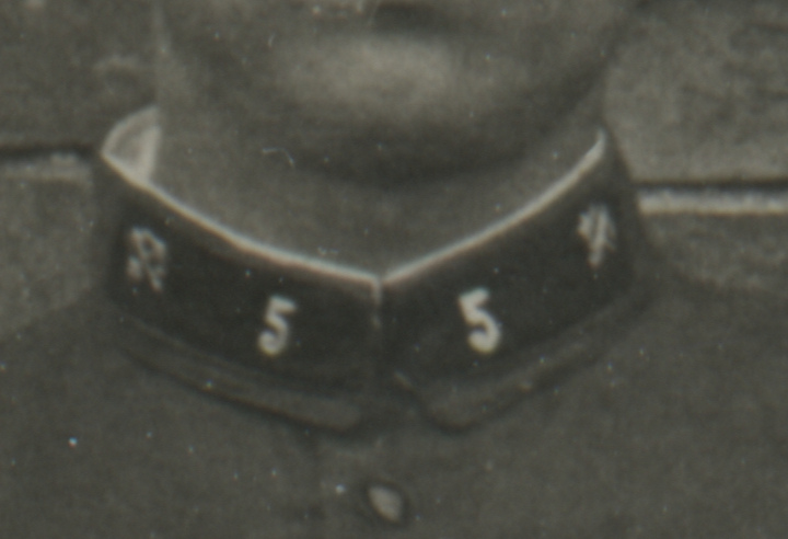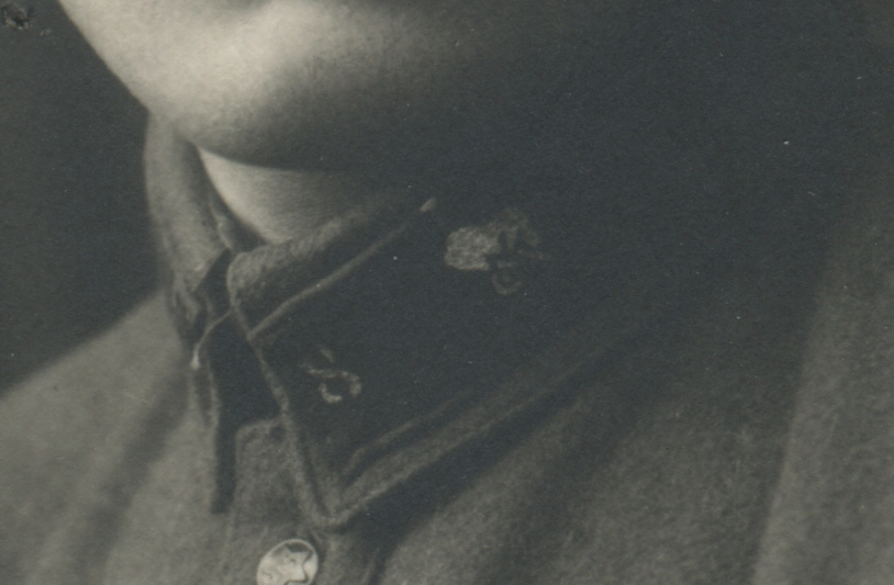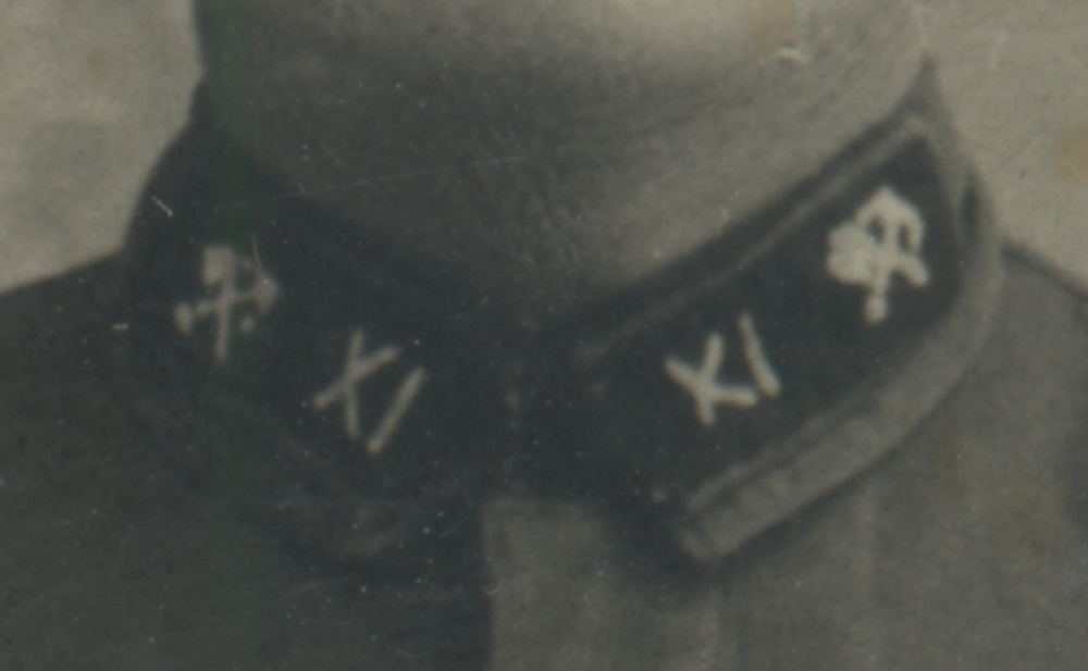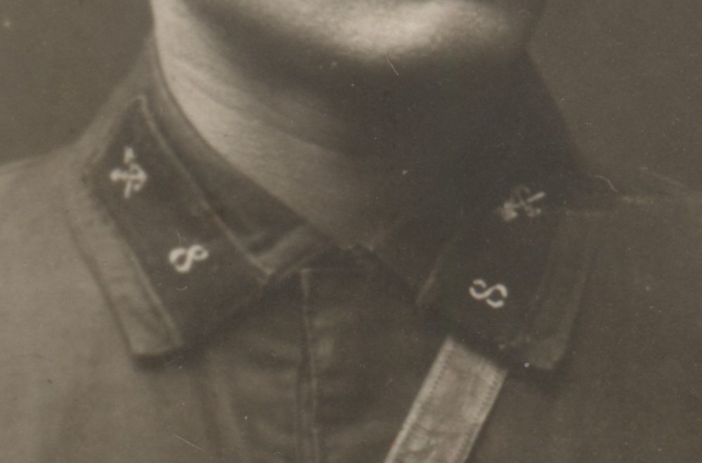 Металлическая эмблема на петлицах красноармейца 1-го железнодорожного полка Б. Алексеева установлена поверх прежней, выполненной краской по трафарету. Присутствует также номер полка («1»). Коллекция автора