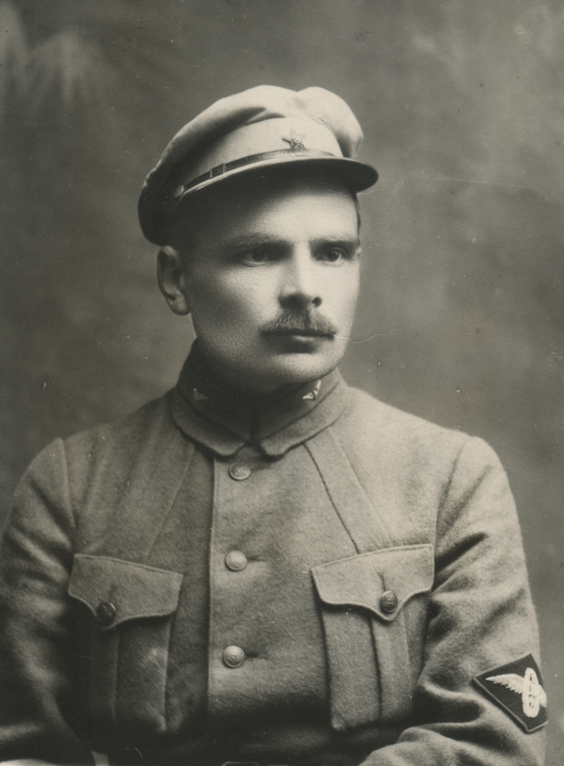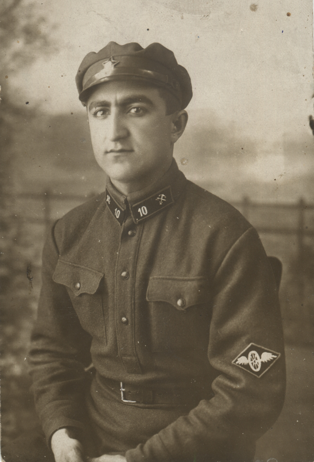 Эмблема ВОСО на нарукавном знаке образца 1919 г. Обращают на себя также внимание петлицы пехотной расцветки со значками № 10. 14 июля 1926 г. Коллекция Николая Жуковского
