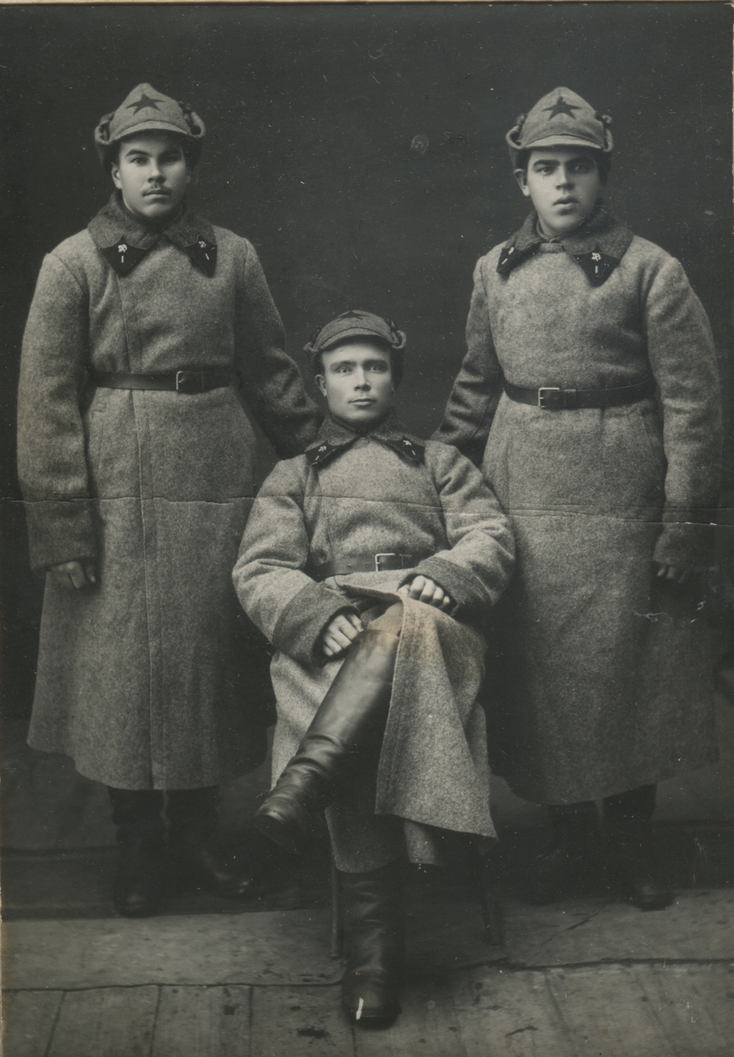 Трое красноармейцев 1-го железнодорожного полка с шифровкой своей части. Для нее использован такой шрифт, что невозможно точно сказать, арабская или римская имелась в виду единица. Коллекция автора