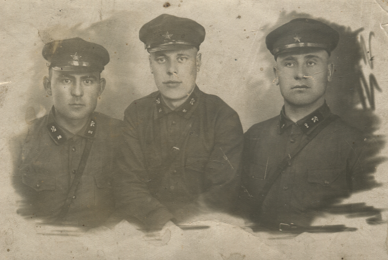 Трое красноармейцев 2-го железнодорожного полка. На петлицах шифровка «2» и значок железнодорожных войск. Ленинград, 1932 год. Коллекция автора